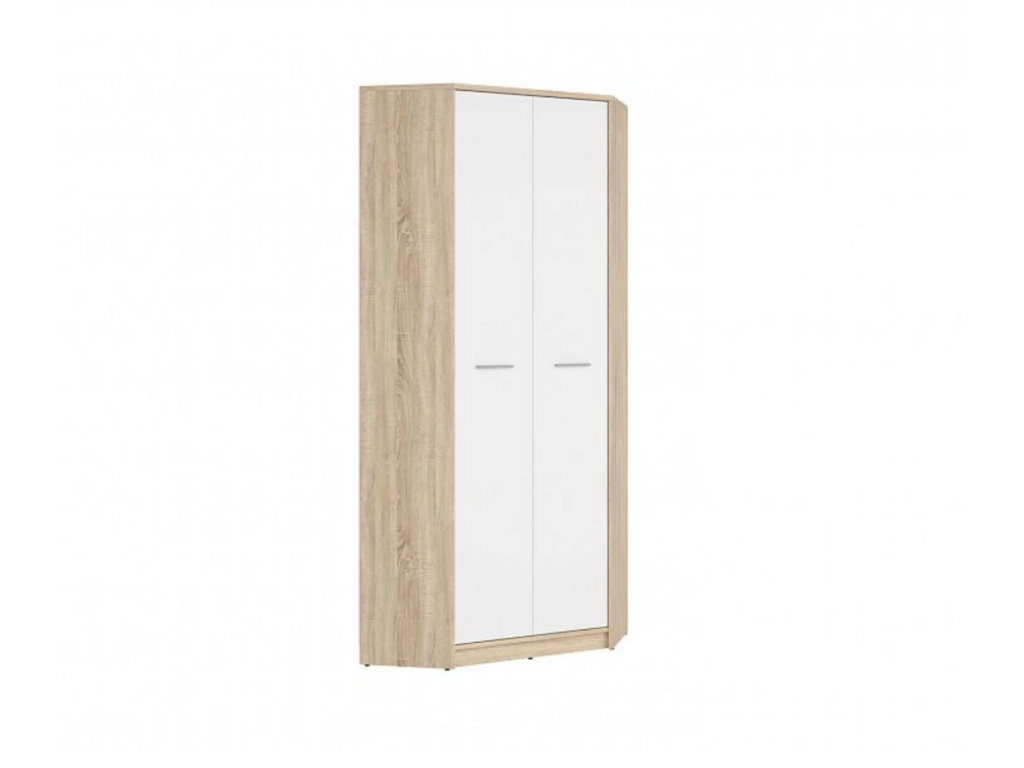Rohová skříň Nepo Plus SZFN2D je univerzálním řešením pro různé místnosti vašeho domova. Skvěle se hodí do dětského pokoje, ložnice i předsíně. Je vyrobena z lamina o tloušťce 1,6 cm s estetickou kombinací korpusu v odstínu Dub Sonoma a bílých dvířek. Vnitřní prostor skříně nabízí jednu praktickou polici a tyč na ramínka o délce 75 cm, ideální pro efektivní uspořádání vašeho oblečení. Dlouhé stříbrné úchytky z tvrzeného plastu dodávají skříni moderní vzhled.