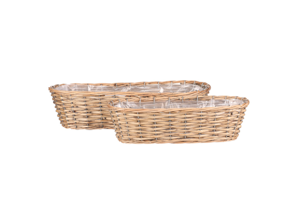 Tato sada dvou proutěných oválných truhlíků v přírodní světlé barvě přináší eleganci a praktičnost do každého prostoru. Každý truhlík je vybaven ochrannou igelitovou vložkou, která zajišťuje dlouhou životnost a snadnou údržbu. Ideální pro květiny i různé dekorace, tyto truhlíky dodají vašemu interiéru nebo exteriéru přirozený a vkusný vzhled.Doplňkové parametry