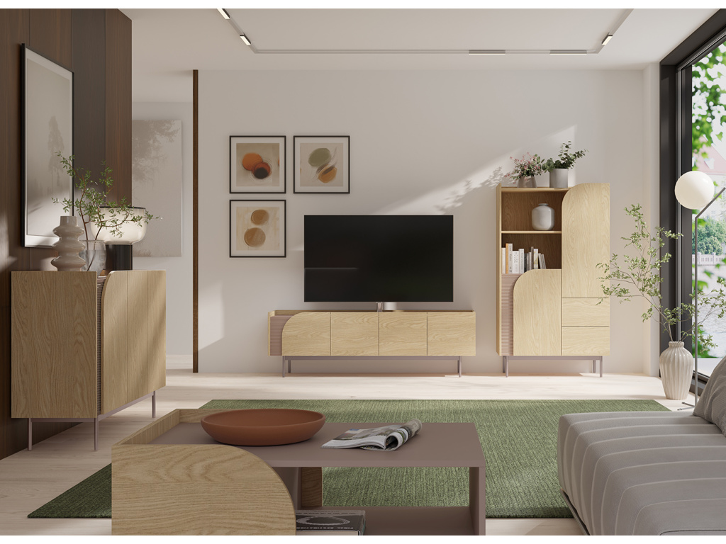Kolekce Carmen zaujme moderním designem se zaoblenými liniemi a výrazným vroubkovaným detailem na čelních plochách. Nábytek stojí na vyšší kovové podnoži v šedé barvě, která celku dodává lehký a současný vzhled. Kolekce je dostupná ve dvou barevných variantách: Makadamie / Dub a Toffie / Dub.