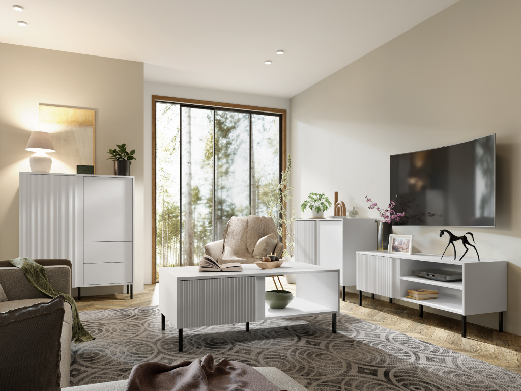 Obývací pokoj Mia představuje kompletní řešení pro moderní a praktický interiér. Sestava kombinuje komody, televizní stolek a konferenční stolek, které nabízejí dostatek úložného prostoru a přispívají k přehlednému uspořádání obývacího pokoje. Kolekce Mia zaujme moderním designem s čistými liniemi a nadčasovým vzhledem. Nábytek je dostupný v dekorech bílá nebo dub věčný / černá, které se snadno kombinují s ostatním vybavením. Jednotlivé elementy kolekce lze navíc mezi sebou libovolně kombinovat podle potřeb vašeho prostoru.