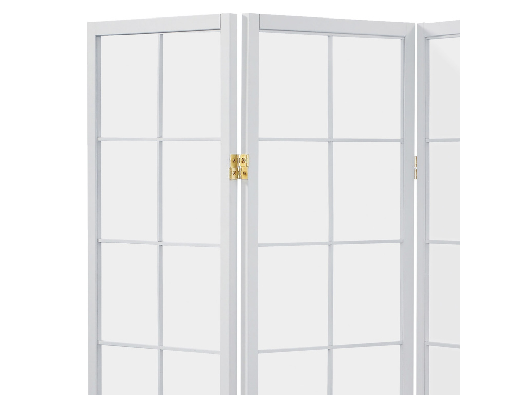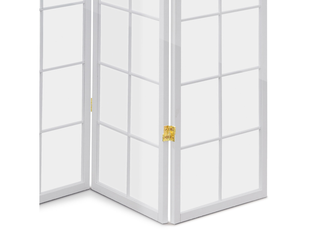 Tento 4dílný volně stojící paraván s konstrukcí z masivního smrkového dřeva v bílém odstínu přináší do vašeho interiéru eleganci a praktičnost. Transparentní lak chrání dřevo a umožňuje vyniknout jeho čistému designu. Výplň z bílé netkané textilie podtrhuje vzdušný a lehký vzhled, díky čemuž paraván snadno zapadne do jakéhokoliv interiéru.