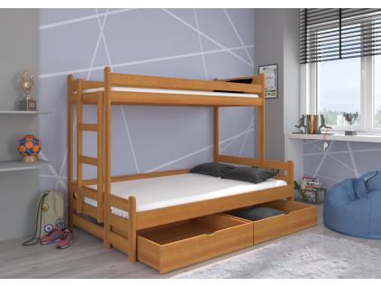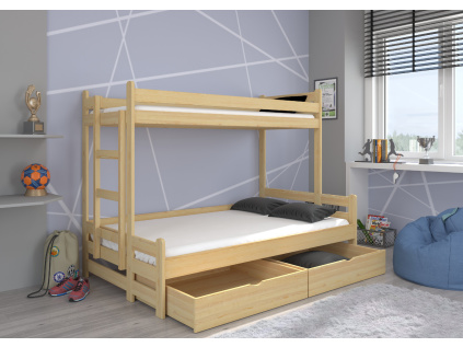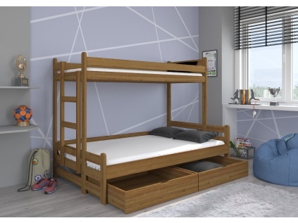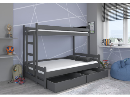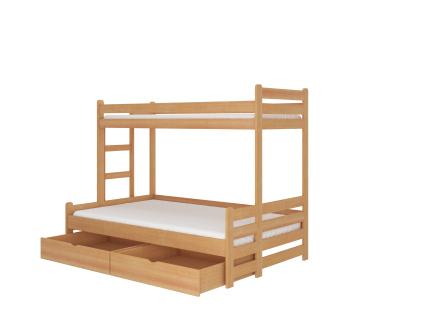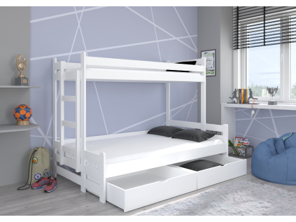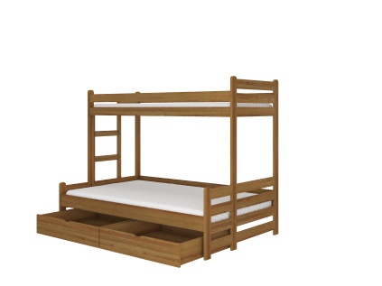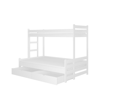Patrová postel Benito, určená pro 3 osoby, je ideálním nábytkem pro malé dětské nebo mládežnické pokoje, kde potřebujete ušetřit místo. S moderním designem a solidní konstrukcí je tato postel navržena pro pohodlí i funkčnost. Postel je vybavena integrovaným žebříkem umístěným v nohách pro snadný a bezpečný přístup na horní patro. Navíc jsou ve spodní části postele dvě prostorné a praktické zásuvky pro uložení lůžkovin, což přispívá k lepší organizaci pokojů. Postel je dodávána s dvěma matracemi - horní patro má pěnovou matraci o tloušťce 8 cm, zatímco na spodním patře je skříňová pružinová matrace o tloušťce 15 cm. Tyto matrace jsou navrženy tak, aby poskytovaly maximální pohodlí a podporu pro zdravý spánek. Tato patrová postel je skvělou volbou pro všechny, kdo hledají funkční a stylové řešení pro své dětské pokoje.