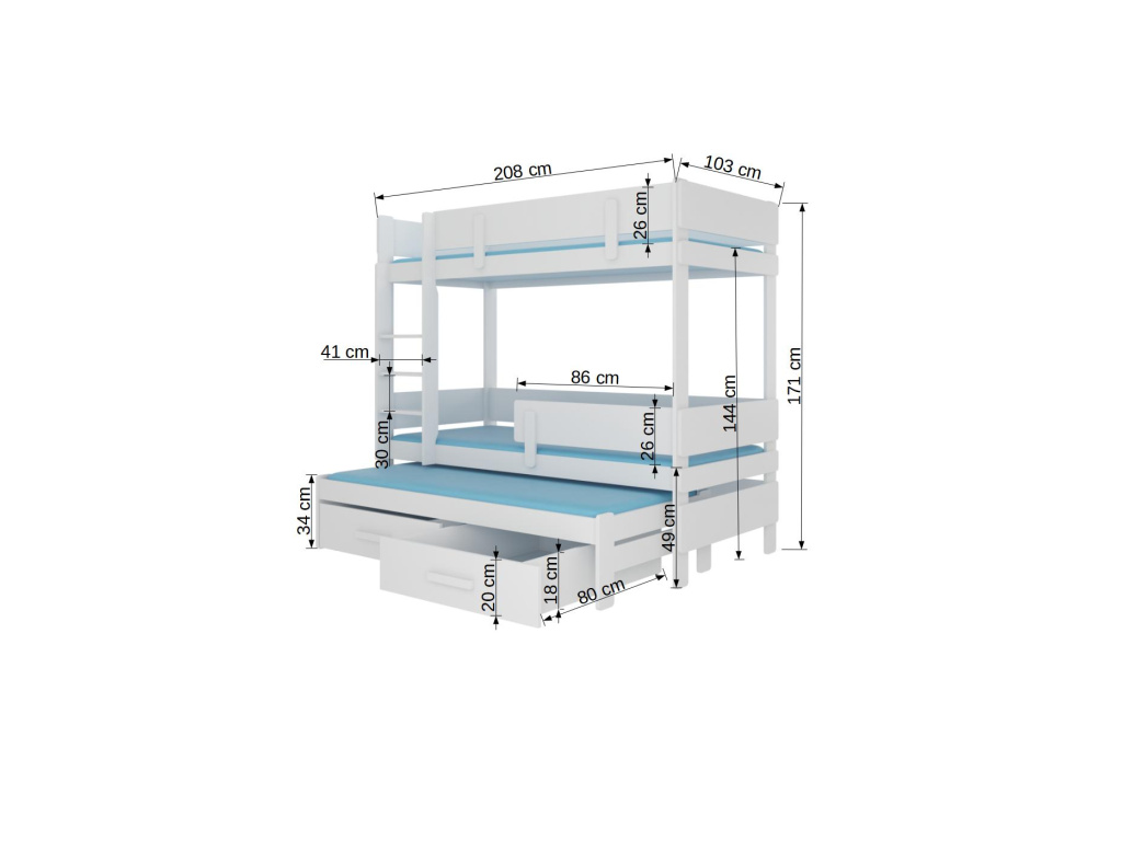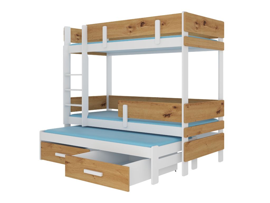Patrová postel Etapo pro 3 osoby je vynikajícím nápadem, jak ušetřit místo v malém dětském pokoji. Nábytek má schůdky a dvě prostorné a funkční zásuvky na lůžkoviny. Obě úrovně jsou navíc vybaveny zábranami pro větší bezpečnost během spánku. Matrace není součástí soupravy.