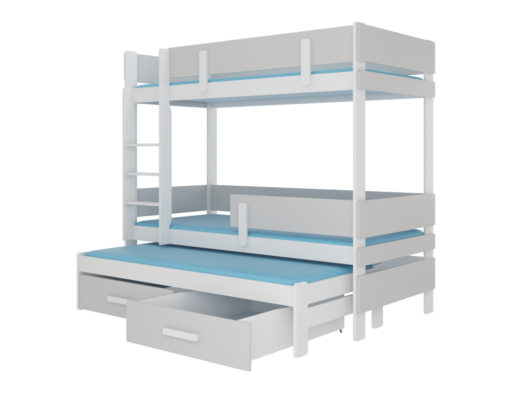 Patrová postel Etapo pro 3 osoby je vynikajícím nápadem, jak ušetřit místo v malém dětském pokoji. Nábytek má schůdky a dvě prostorné a funkční zásuvky na lůžkoviny. Obě úrovně jsou navíc vybaveny zábranami pro větší bezpečnost během spánku. Matrace není součástí soupravy.