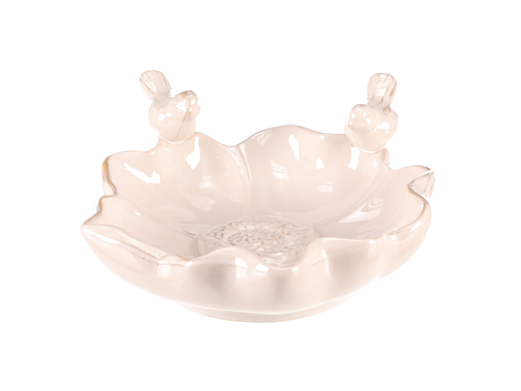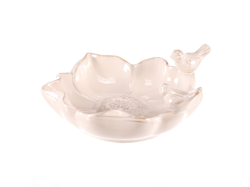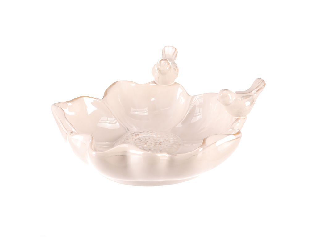 Čistě bílé keramické pítko pro ptáčky ve tvaru květu je nádhernou dekorací, která přitahuje pozornost nejen ptáčků, ale i všech kolemjdoucích a návštěvníků. Dva pěvci sedící na okraji pítka dodávají celému pítku hravý a veselý vzhled. Příjemně oživí vaši zahradu a stane se oblíbeným místem pro vaše opeřené návštěvníky, kteří se k vám tak budou rádi vracet.Doplňkové parametry