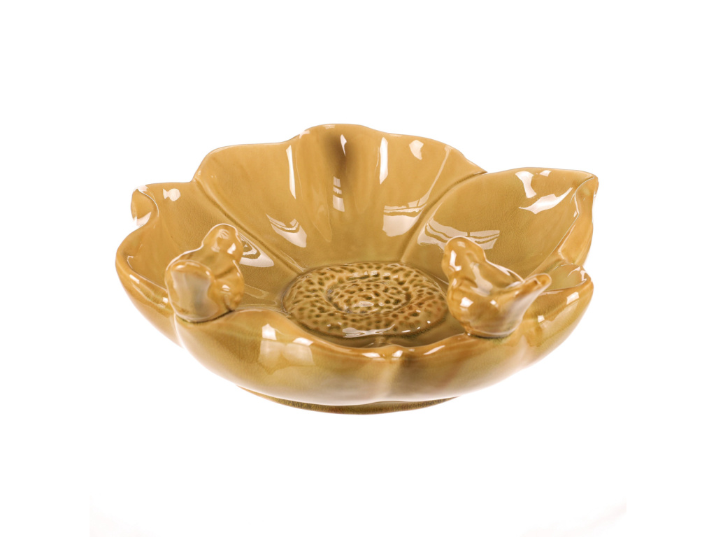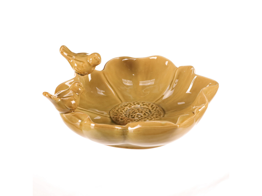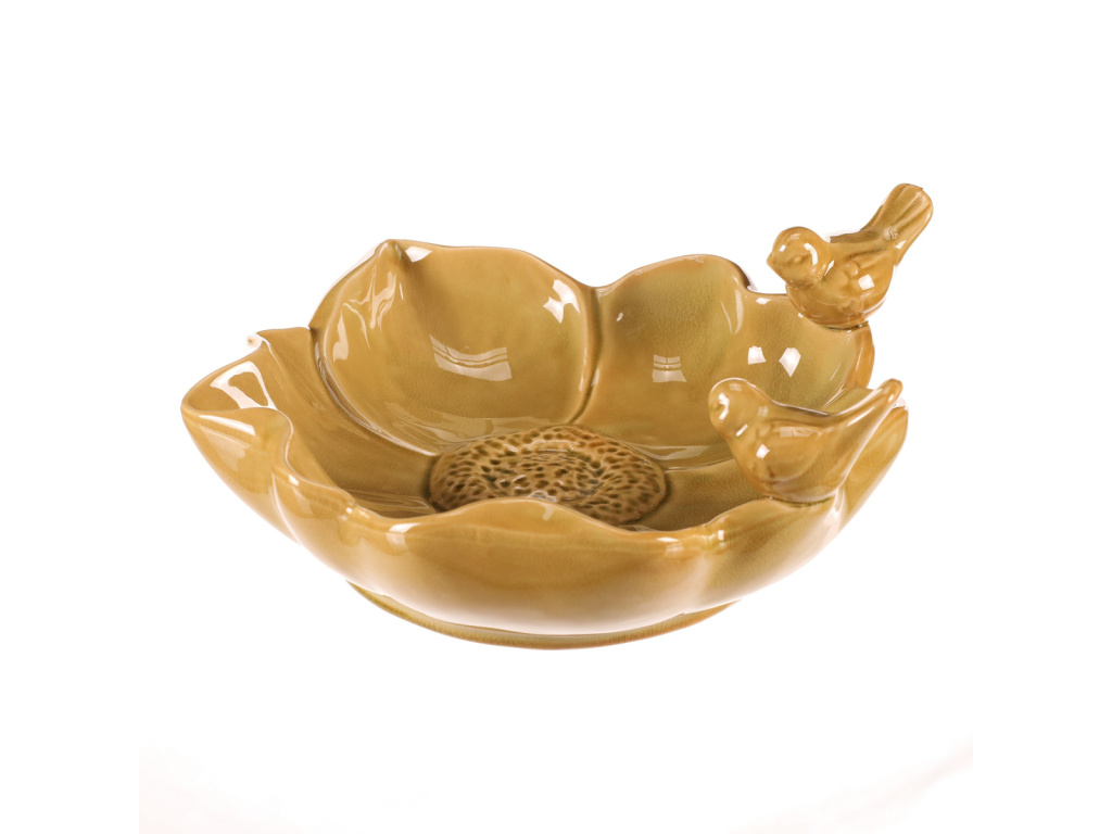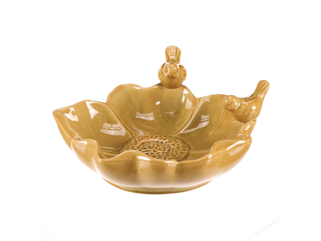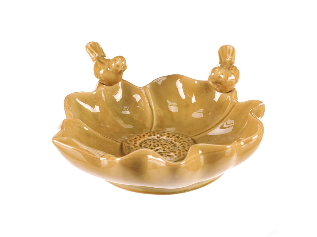 Světle zelené keramické pítko pro ptáčky ve tvaru květu je nádhernou dekorací, která přitahuje pozornost nejen ptáčků, ale i všech kolemjdoucích a návštěvníků. Dva pěvci sedící na okraji pítka dodávají celému pítku hravý a veselý vzhled. Příjemně oživí vaši zahradu a stane se oblíbeným místem pro vaše opeřené návštěvníky, kteří se k vám tak budou rádi vracet.Doplňkové parametry