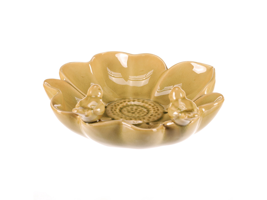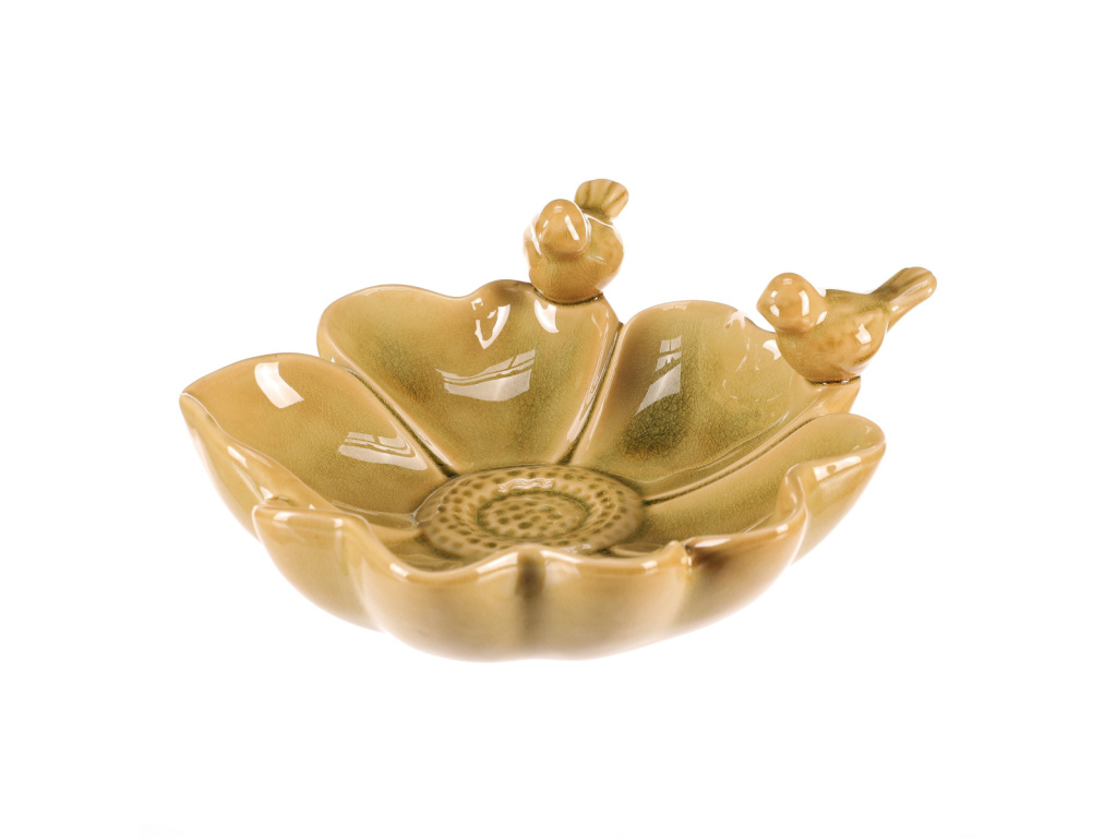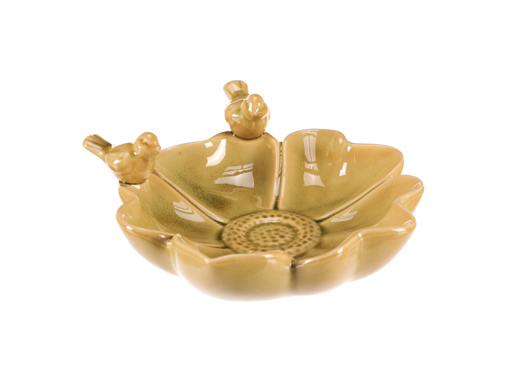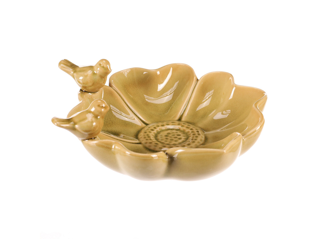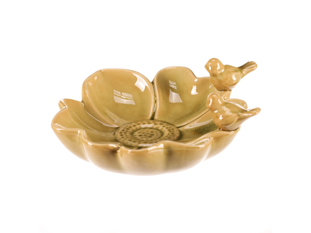 Světle zelené keramické pítko pro ptáčky ve tvaru květu je nádhernou dekorací, která přitahuje pozornost nejen ptáčků, ale i všech kolemjdoucích a návštěvníků. Dva pěvci sedící na okraji pítka dodávají celému pítku hravý a veselý vzhled. Příjemně oživí vaši zahradu a stane se oblíbeným místem pro vaše opeřené návštěvníky, kteří se k vám tak budou rádi vracet.Doplňkové parametry
