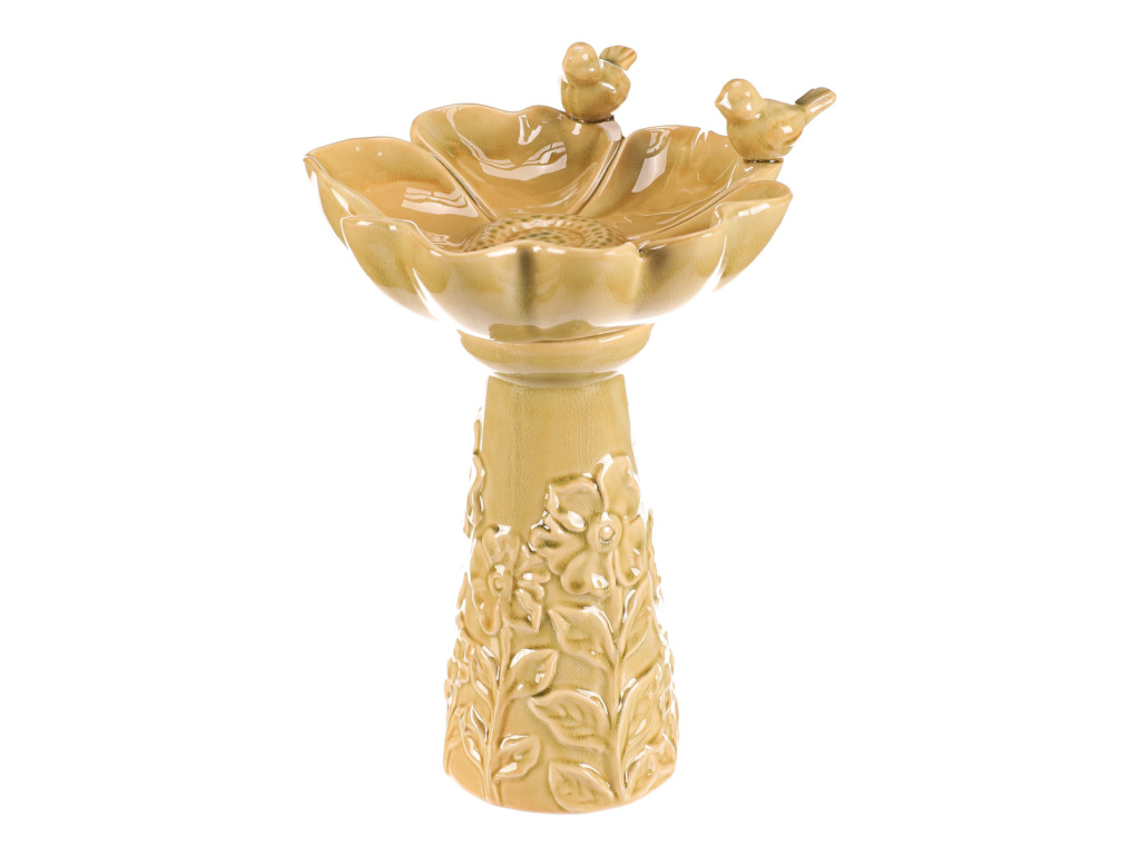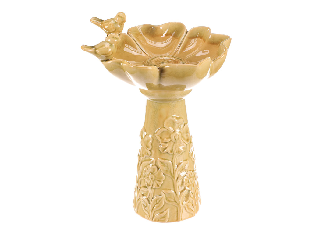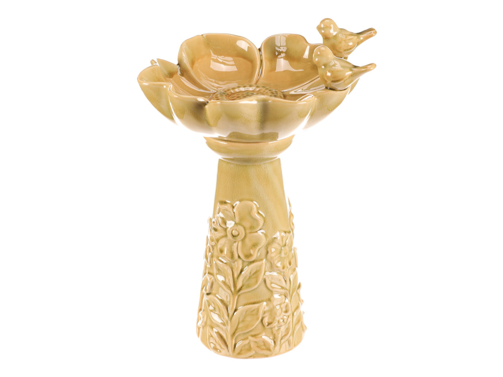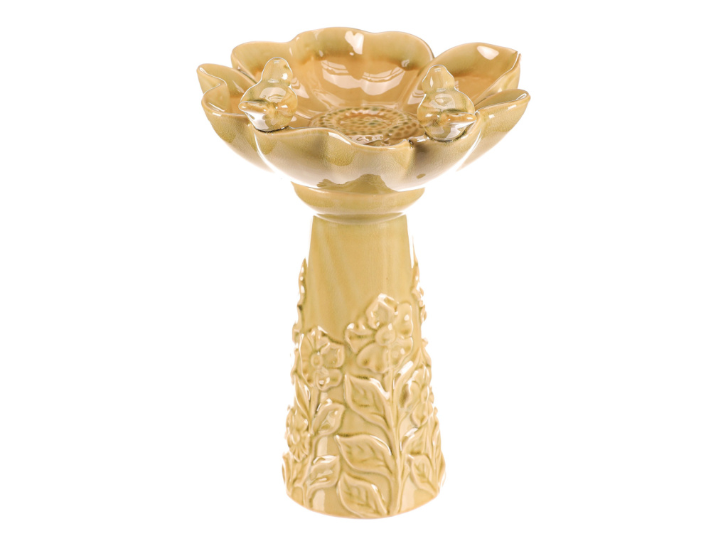 Světle zeleně zbarvené keramické pítko pro ptáčky, ve tvaru květu na vysoké noze, je vznešenou zahradní dekorací, která přitahuje pozornost a přináší radost nejen ptáčkům, ale i lidem. Tvar velkého květu se dvěma pěvci, kteří se na něm natrvalo usadili, přidává do vašeho prostoru dokonalé oživení. Robustní keramická noha, kterou můžete snadno ukotvit pomocí otvoru na dně, je vysoce praktická a podtrhuje celkovou eleganci produktu. Takové pítko rozhodně bude dělat radost nejen vám, ale nadchne i vaše návštěvníky včetně všech kolemjdoucích, kteří se na chvíli zastaví, aby si užili jeho krásu.Doplňkové parametry