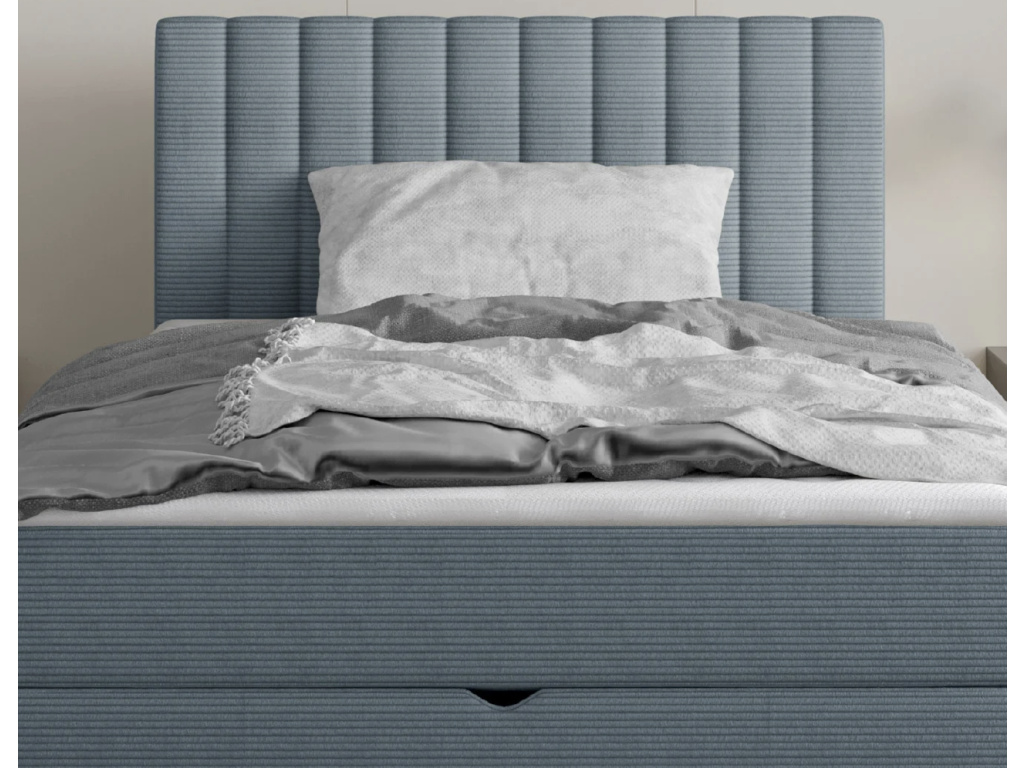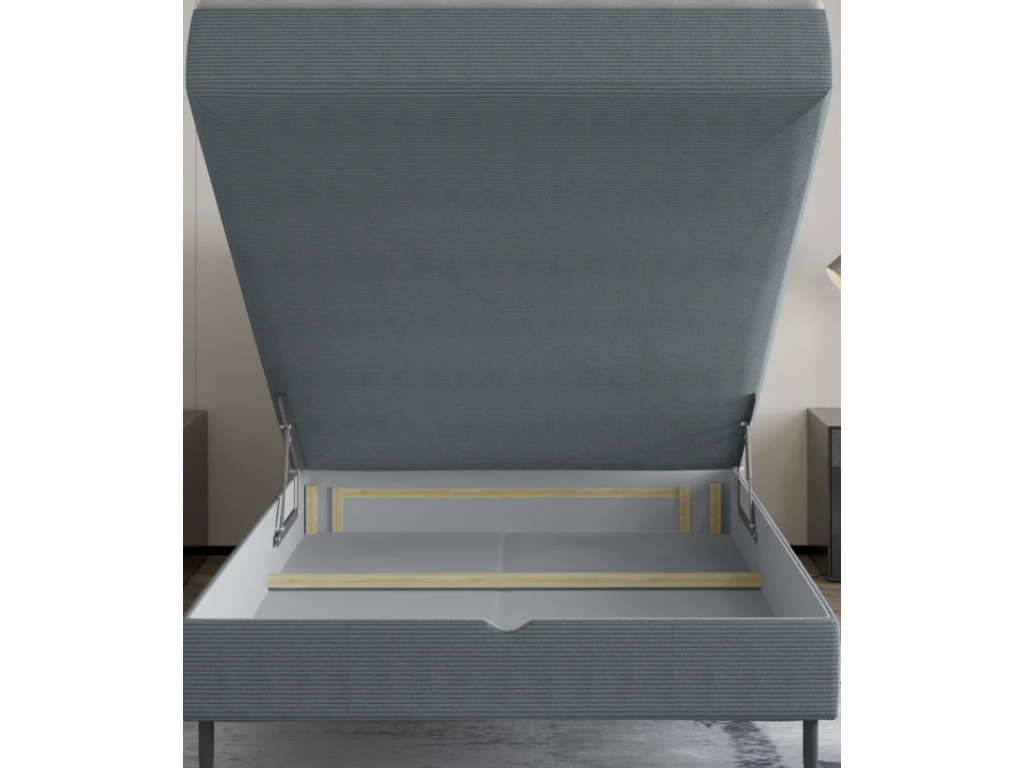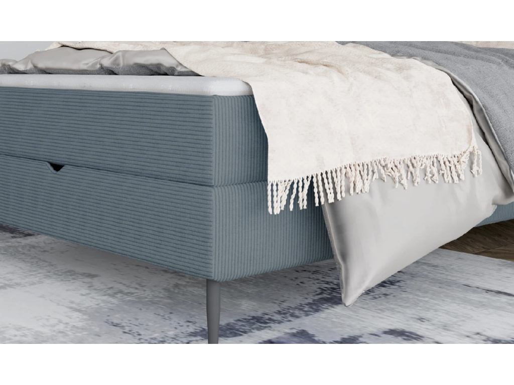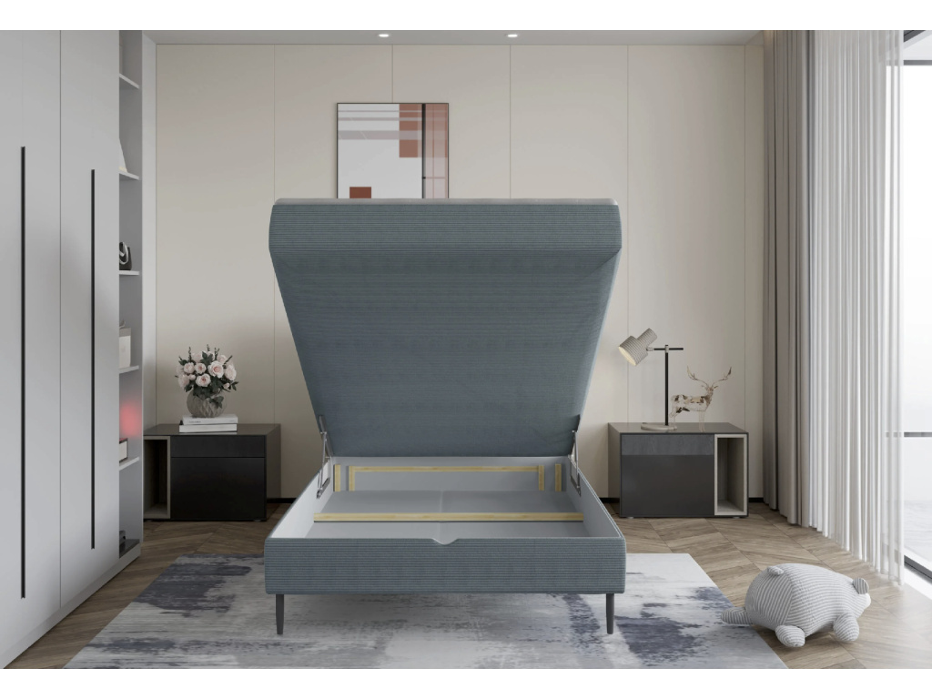 Čelo postele je čalouněné a zdobené svislými prošíváními, což celé posteli dodává moderní vzhled a zároveň zvyšuje pocit pohodlí. Součástí postele Nepo je zvedací rám, který umožňuje snadný přístup k prostorné nádobě na lůžkoviny umístěné pod matrací. Tento inteligentní úložný prostor nabízí praktické řešení pro ukládání ložního prádla, polštářů nebo sezónního oblečení, čímž pomáhá udržet ložnici v pořádku.