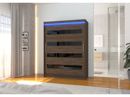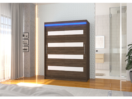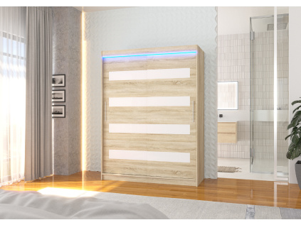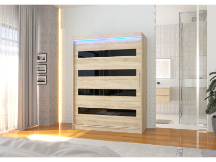 Přední strana skříně je zdobena elegantními lacobely, což dodává skříni nejenom na kráse, ale zároveň zajišťuje snadnou údržbu a dlouhodobou odolnost proti poškrábání. LED osvětlení uvnitř skříně poskytuje dostatek světla pro snadný výběr oblečení a zároveň vytváří příjemnou atmosféru ve vaší místnosti.