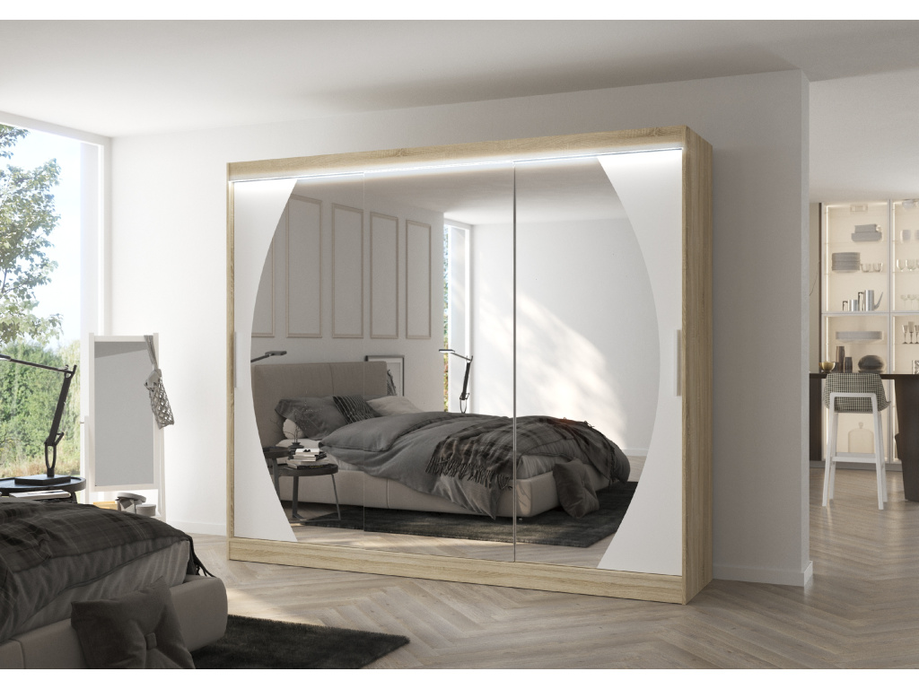 Zrcadlová posuvná šatní skříň Cambe představuje ideální řešení pro efektivní organizaci vašeho oblečení a zároveň pro optické zvětšení prostoru vašeho interiéru. Je vybavena prostornými policemi a tyčí, díky kterým můžete pohodlně zavěsit šaty, obleky, i další kousky oblečení. Zrcadla na předních dveřích nejenže přidávají estetický rozměr, ale také zvětšují a rozjasňují místnost, čímž vytvářejí iluzi většího prostoru. Posuvný mechanismus dveří je velice praktický, neboť šetří místo, což je obzvláště užitečné v menších místnostech nebo úzkých chodbách. Navíc je skříň vybavena účinným LED osvětlením, které kromě praktické funkce dodává skříni a místnosti nádherné kouzlo. Zrcadlová šatní skříň Cambe tak kombinuje funkčnost, styl a moderní design, který obohatí jakýkoliv interiér.