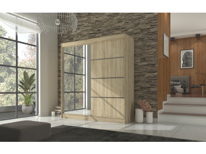Posuvná šatní skříň Gilton se zrcadlem je dokonalým řešením pro ty, kdo hledají jak praktičnost, tak vysoký estetický standard. Tento kus nábytku je vybaven prostornými policemi a tyčí na zavěšení, kde si můžete uschovat všechny vaše šaty, obleky, svrchní oděvy a košile. Navíc, na přední straně skříně je zrcadlo a ozdobné pruhy, které skříni dodávají jedinečný a sofistikovaný vzhled.