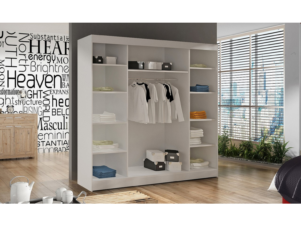 Posuvná šatní skříň Perqs se zrcadlem nabízí skvělé řešení pro organizaci vašeho oblečení. Tato šatní skříň je vybavena prostornými policemi a tyčí na zavěšení, které poskytují dostatek místa pro ukládání šatů, obleků, svrchních oděvů a košil.