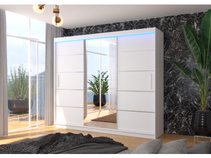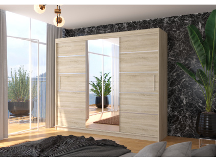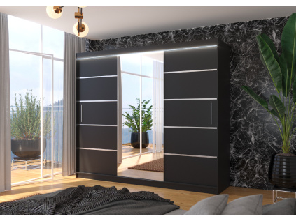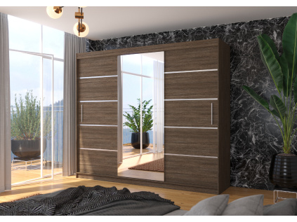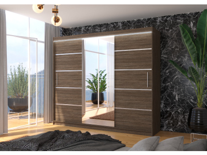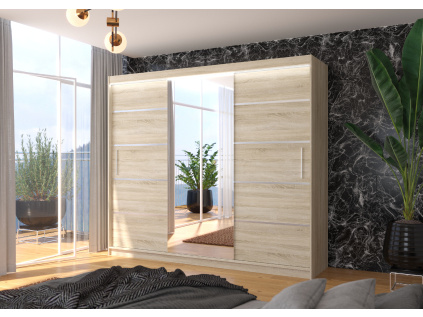 Posuvná skříň se zrcadlem SALTO 250 je designově vyladěný kousek, který zaujme svým moderním vzhledem a praktičností. Tato skříň není jen obyčejným úložným prostorem, ale stane se dominantou vaší ložnice nebo předsíně. Vyrobena z kvalitních materiálů, nabízí dostatek prostoru pro vaše oblečení a doplňky, zatímco posuvný mechanismus s hladkým chodem usnadňuje přístup i v omezených prostorách. Velké zrcadlo nejen že opticky zvětší prostor, ale je také praktické pro každodenní přípravu. LED osvětlení přidává na eleganci a zvyšuje funkčnost skříně.