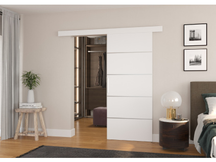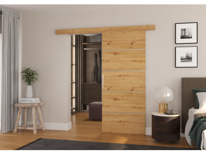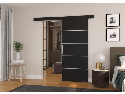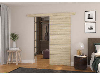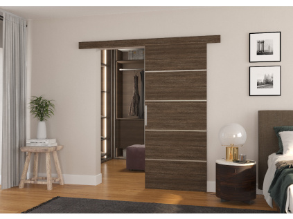 Posuvné dveře Tony představují ideální řešení pro efektivní využití prostoru ve vašem interiéru. Tyto dveře nejenže šetří místo, ale také opticky zvětšují místnost díky svému designu. Jsou vyrobeny z laminované desky, která je zdobena vodorovnými pruhy ve stříbrné barvě, což dodává dveřím moderní vzhled. Posuvný mechanismus umožňuje snadné otevírání a zavírání bez nutnosti volného prostoru, který by byl jinak potřebný pro klasické otvírání dveří.