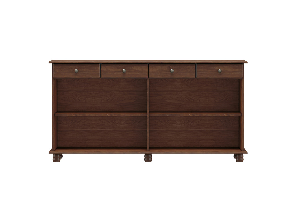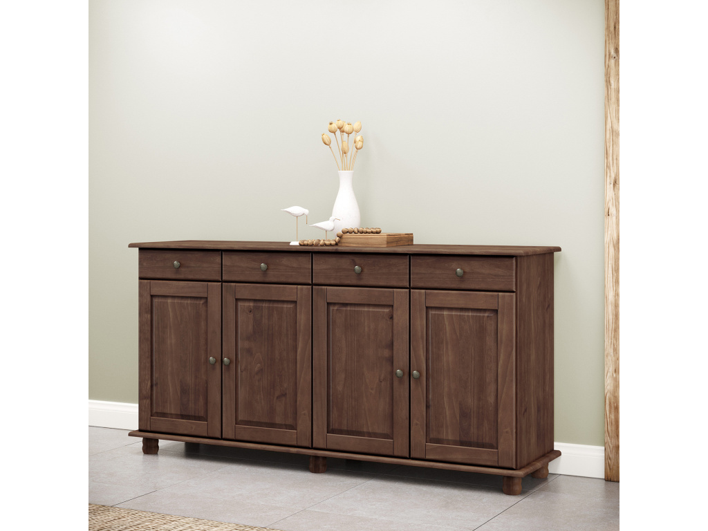 Příborník RUBI v tmavě hnědém provedení je stylový a funkční kus nábytku z masivní borovice, který dodá vašemu interiéru eleganci a teplo přírodního dřeva. Nabízí čtyři prostorné zásuvky s kovovými pojezdy pro hladké otevírání a čtyři dvířka ukrývající dvě praktické police, ideální pro uložení nádobí, sklenic nebo textilií. Tmavě hnědá barva podtrhuje klasický vzhled a snadno zapadne do tradičně i moderně laděných prostor.