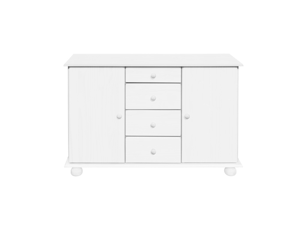 Příborník je navržen s ohledem na praktičnost a úložný prostor. Nabízí 4 zásuvky s kovovými pojezdy, což usnadňuje organizaci a ukládání vašich věcí. Dvě skříňky s dvířky jsou vybaveny policemi, což vám umožňuje uspořádat a schovat věci, které chcete mít na dosah ruky.