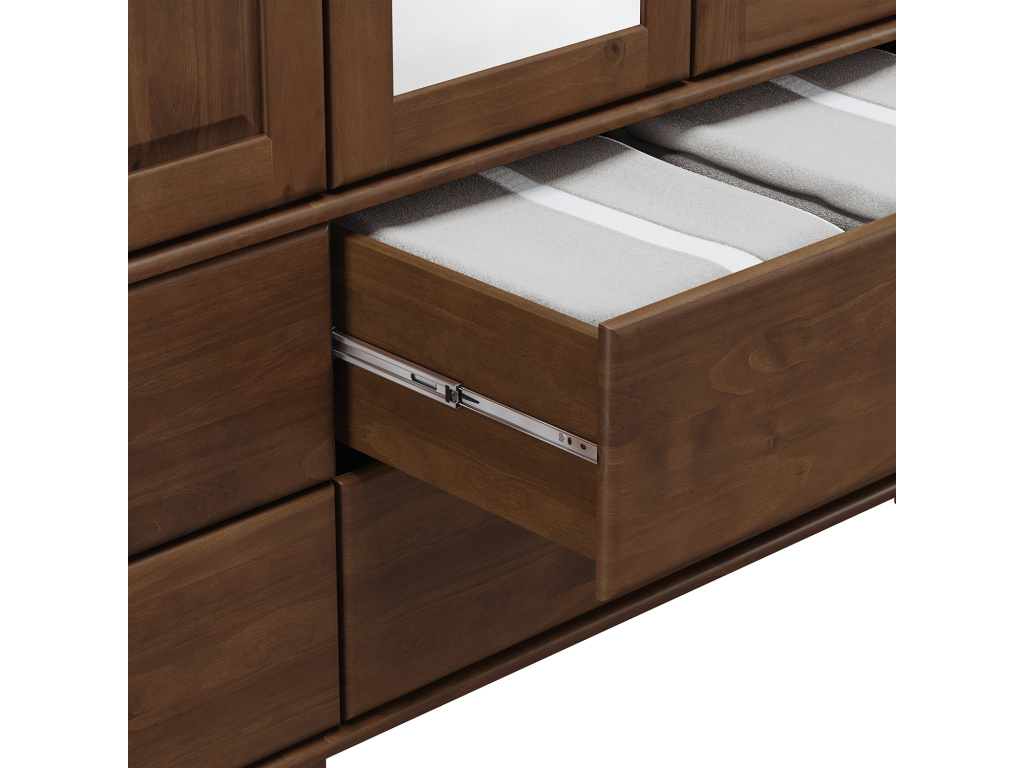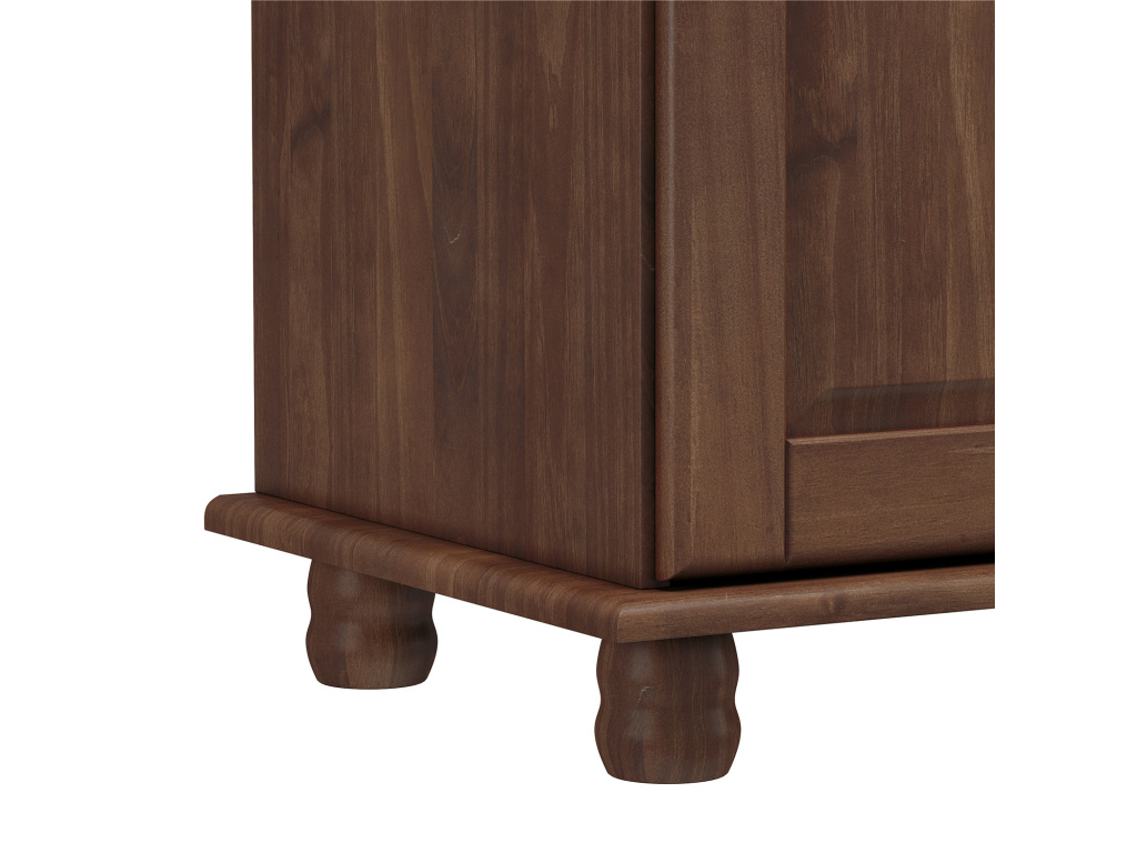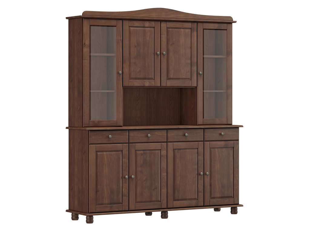 Příborník s nástavcem RUBI v tmavě hnědém provedení je elegantní a robustní kus nábytku vyrobený z masivní borovice, který se stane dominantou každé kuchyně nebo jídelny. Dolní část nabízí čtyři plné dveře a čtyři zásuvky s kvalitními kovovými pojezdy, ideální pro praktické uložení příborů, textilií či nádobí. Horní nástavec je vybaven dvěma prosklenými a dvěma plnými dvířky, které poskytují prostor pro vystavení porcelánu či dekorací i diskrétní úložné řešení. Tmavě hnědý odstín dodává příborníku sofistikovaný a nadčasový vzhled, který zapadne do klasického i moderního interiéru.