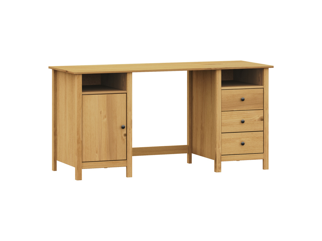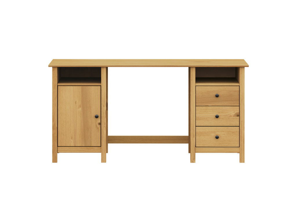 Psací stůl TORINO zaujme svým kvalitním zpracováním z masivní borovice a přírodním vzhledem, který do interiéru vnese teplo a útulnost. Povrch je ošetřen voskem v medovém odstínu, jenž zvýrazňuje kresbu dřeva a chrání ho před opotřebením. Stůl nabízí dvě otevřené police, jedny dvířka a tři prostorné zásuvky s kovovými pojezdy, které zajišťují hladký a tichý chod. Stylové kovové úchytky v provedení černěná mosaz dodávají nábytku rustikální eleganci a charakter. Psací stůl TORINO spojuje funkčnost, odolnost a nadčasový design, díky čemuž se stane ozdobou i praktickým pomocníkem vaší pracovny nebo domácí kanceláře.
