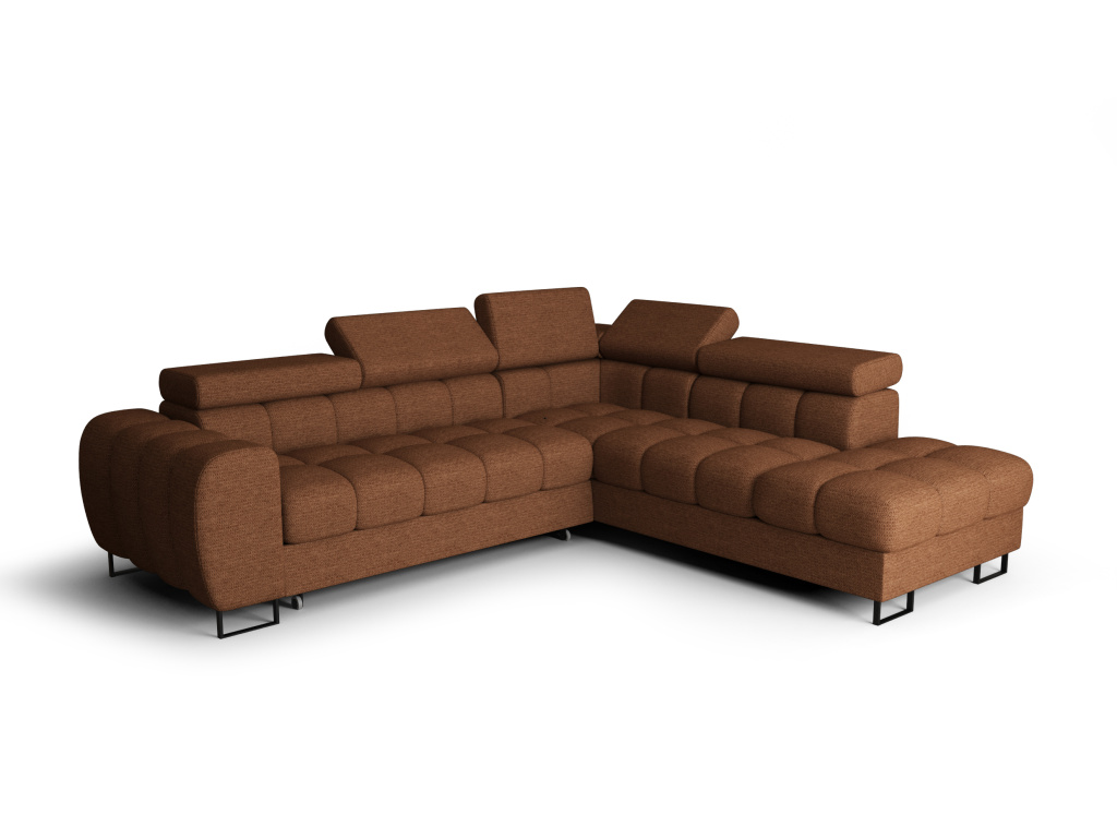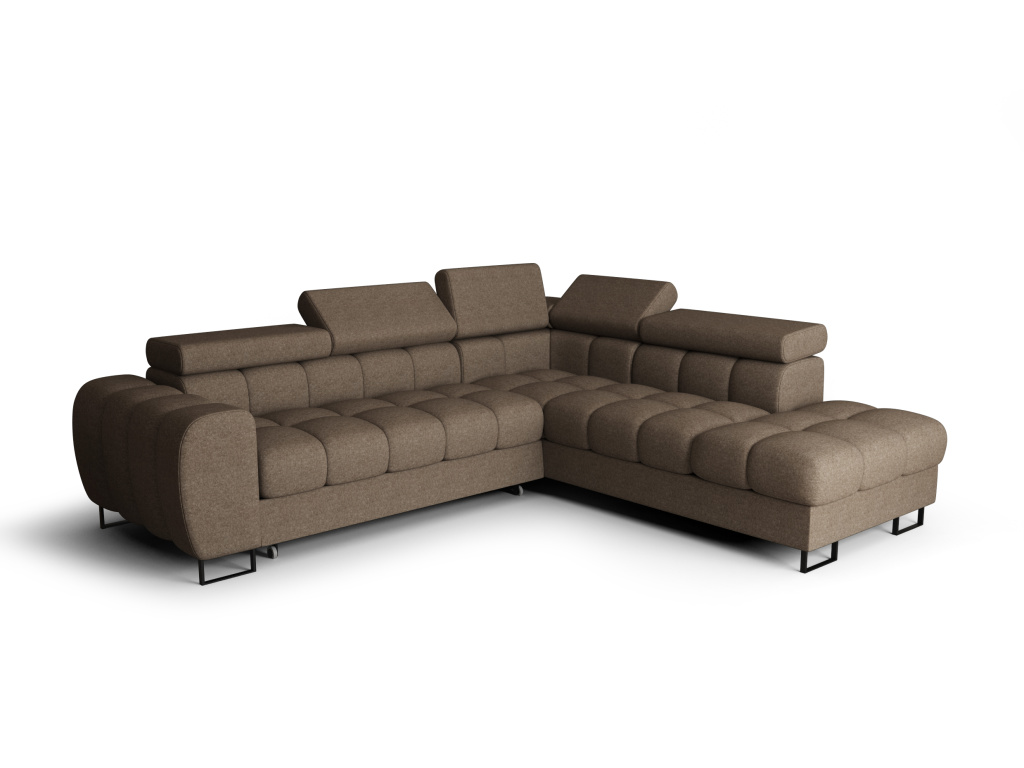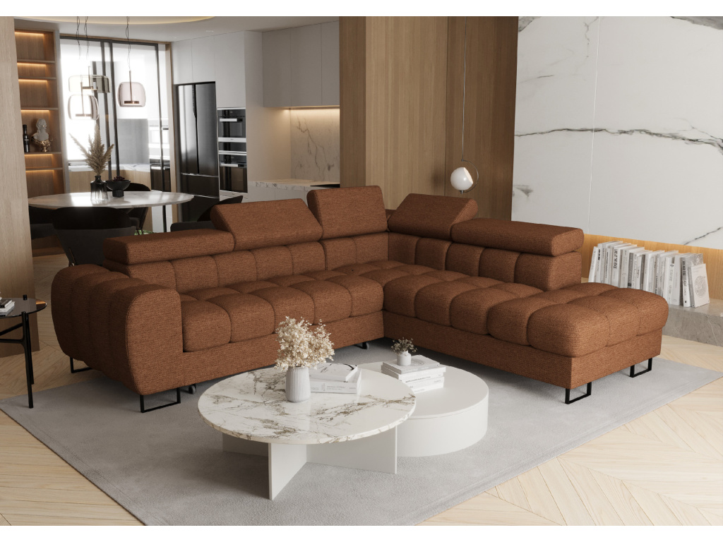 Rohová pohovka Aspen je stylový a praktický kus nábytku, který se stane dokonalým doplňkem vašeho obývacího pokoje, pokoje pro hosty nebo jiné obytné místnosti. Nabízí ideální kombinaci pohodlí, funkčnosti a moderního designu, díky čemuž poskytuje příjemné místo pro každodenní odpočinek i setkávání s rodinou a přáteli. Během dne slouží jako prostorná a komfortní pohovka, zatímco večer ji lze snadno rozložit a vytvořit praktické lůžko pro příležitostné přespání hostů. Nastavitelné opěrky hlavy umožňují přizpůsobit polohu přesně podle vašich potřeb, takže si můžete užít maximální pohodlí při relaxaci, sledování televize nebo čtení. Praktickým prvkem je také vestavěný úložný prostor na ložní prádlo, který pomáhá udržet váš interiér přehledný a organizovaný. Charakteristický design inspirovaný tvarem čokoládové tyčinky dodává modelu Aspen originální vzhled, který zaujme na první pohled a dodá každému interiéru jedinečný styl. Vysoké nohy ve stříbrném nebo černém provedení podtrhují moderní charakter pohovky a zároveň usnadňují úklid pod nábytkem. Díky široké nabídce kvalitních čalounických látek v různých barvách a strukturách si můžete pohovku přizpůsobit přesně podle stylu svého domova, přičemž všechny materiály jsou pečlivě vybírány tak, aby byly odolné, snadno se čistily, chránily před politím a byly vhodné i do domácností s domácími mazlíčky. Rohová pohovka Aspen je ideální volbou pro ty, kteří hledají moderní, pohodlný a praktický nábytek pro každodenní život.