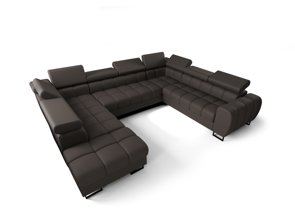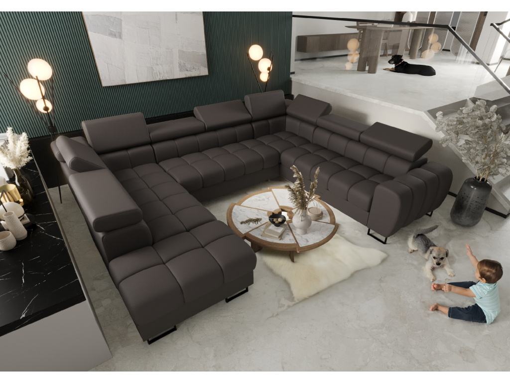 Rohová pohovka Aspen Max I z přírodní kůže ve tvaru U o rozměrech 265 × 350 × 225 cm je luxusní a mimořádně prostorný model, který promění váš obývací pokoj v dokonalé místo pro odpočinek i společné chvíle s rodinou a přáteli. Díky velkorysému prostoru k sezení poskytuje maximální komfort během dne a zároveň nabízí možnost občasného spaní pro hosty. Nastavitelné opěrky hlavy umožňují přizpůsobit polohu přesně podle vašich individuálních potřeb, takže si můžete užít dokonalou relaxaci při sledování televize, čtení nebo odpočinku po náročném dni. Praktickým prvkem jsou také dvě prostorné skládací přihrádky na ložní prádlo, které usnadňují organizaci domácnosti a poskytují dostatek místa pro uložení textilií. Čalounění z kvalitní celozrnné přírodní kůže dodává pohovce elegantní a luxusní vzhled, vysokou odolnost a dlouhou životnost, přičemž pravá kůže je použita na všech viditelných částech nábytku včetně boků a zadní části. Charakteristický design inspirovaný tvarem čokoládové tyčinky dodává modelu Aspen jedinečný a originální vzhled, který dokonale zapadá do současných trendů v interiérovém designu. Vysoké nohy ve stříbrném nebo černém provedení podtrhují moderní charakter pohovky a zároveň usnadňují úklid pod nábytkem. Rohová pohovka Aspen Max I z přírodní kůže je ideální volbou pro ty, kteří hledají spojení luxusních materiálů, moderního designu a praktických funkcí v jednom výjimečném kusu nábytku.