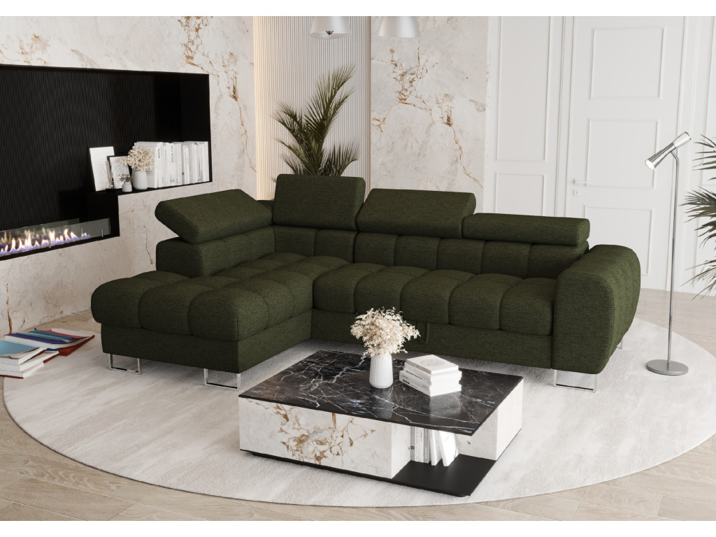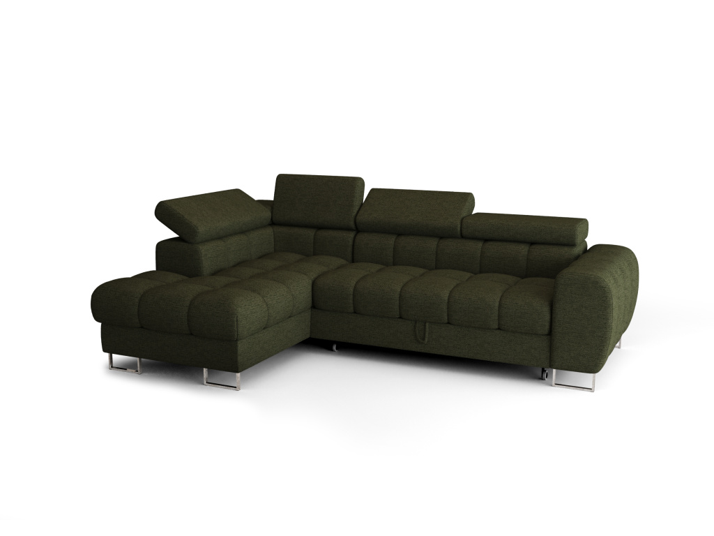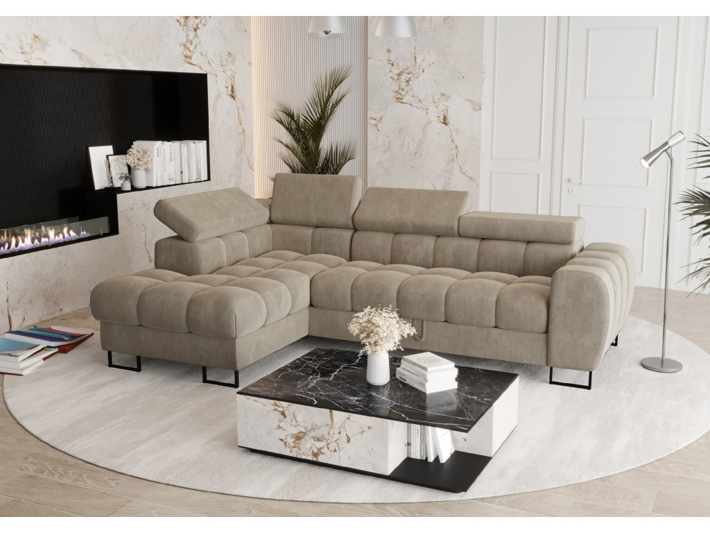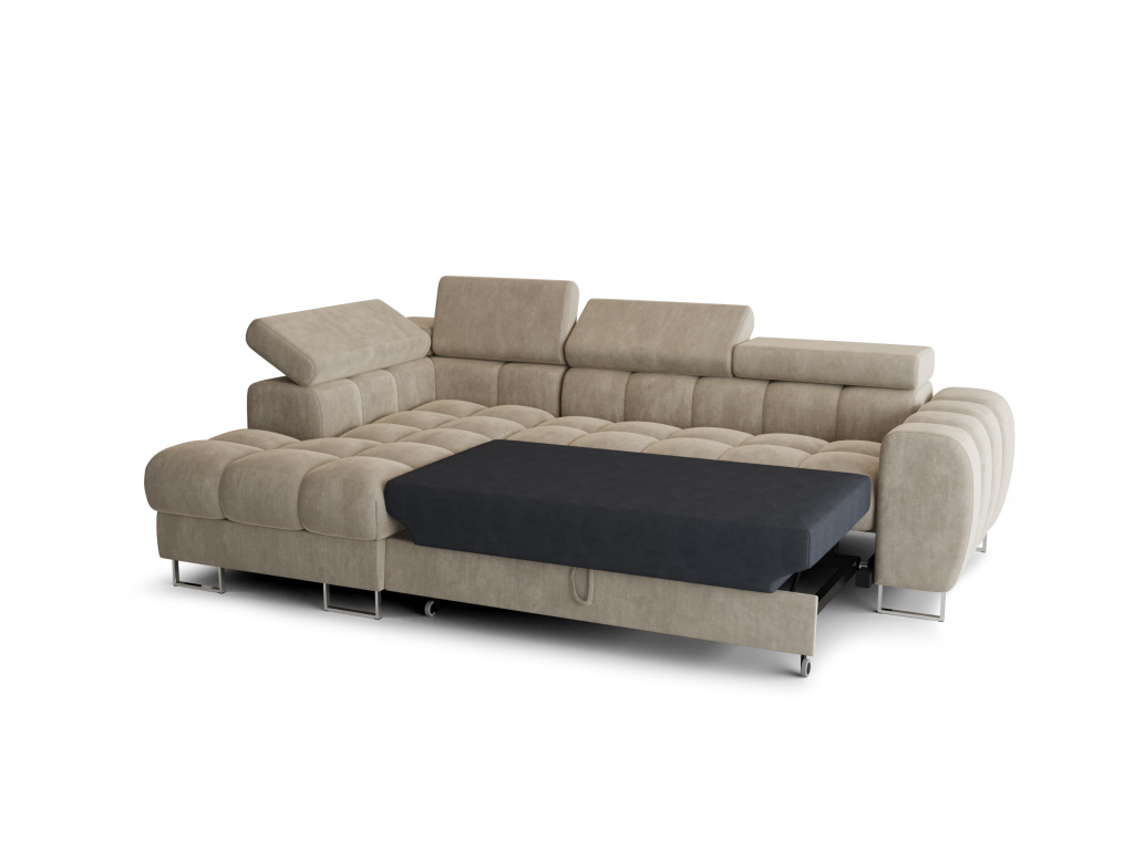 Rohová rozkládací pohovka Aspen Mini je stylový a praktický kus nábytku, který promění váš obývací pokoj, pokoj pro hosty či jiný prostor v dokonalé místo pro relaxaci. Nabízí pohodlné sezení i možnost příležitostného spaní, takže během dne slouží jako prostorná a komfortní pohovka a večer ji snadno proměníte na lůžko pro návštěvy. Nastavitelné opěrky hlavy umožňují nastavit ideální polohu pro maximální pohodlí a vestavěný úložný prostor poskytuje praktické místo pro uložení ložního prádla. Moderní design inspirovaný tvarem čokoládové tyčinky dodává interiéru originální vzhled a dělá z modelu Aspen Mini výrazný prvek každé místnosti. Vysoké nohy ve stříbrném nebo černém provedení podtrhují elegantní styl pohovky a zároveň usnadňují úklid pod nábytkem. Široká nabídka kvalitních čalounických látek v různých barvách a strukturách umožňuje přizpůsobit vzhled přesně vašemu interiéru, přičemž všechny materiály jsou pečlivě vybírány tak, aby byly odolné, snadno se čistily, odolávaly polití a byly vhodné i do domácností s domácími mazlíčky – díky tomu získáte nejen krásnou, ale také praktickou pohovku pro každodenní život.