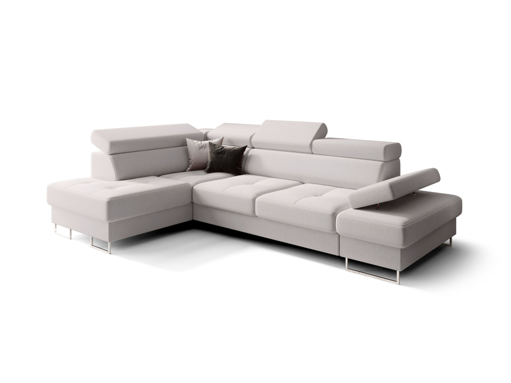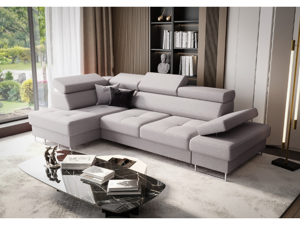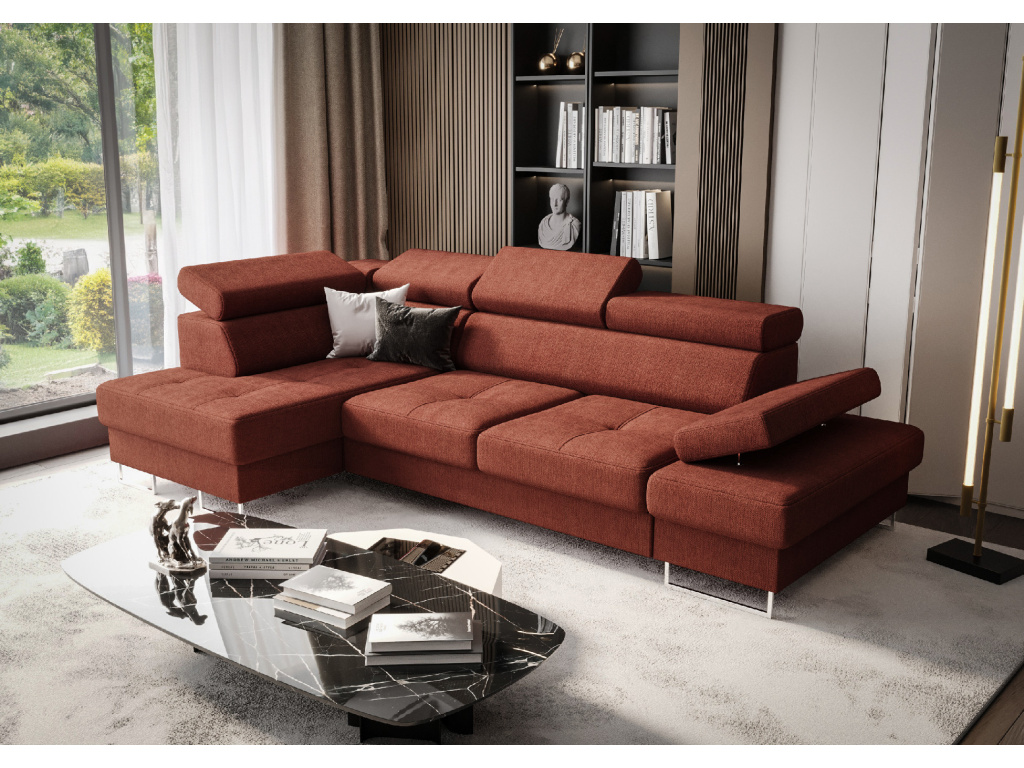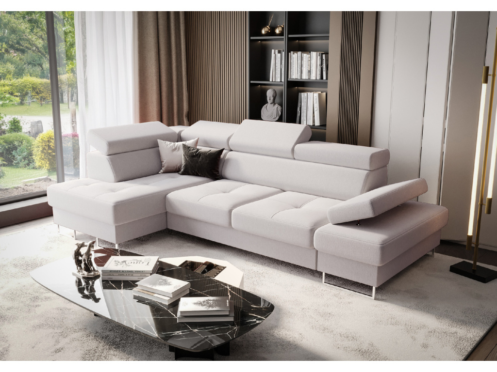 Rohová sedací souprava GALAXY MINI 170×280 je perfektní volbou pro ty, kteří hledají kompaktní, ale zároveň stylové a maximálně funkční řešení do obývacího prostoru. Nadčasový design s moderním nádechem, čisté linie a elegantní prošívání dodávají sedačce atraktivní vzhled, který snadno sladíte s jakýmkoli interiérem. Díky praktické funkci spaní s mechanismem delfín během chvíle vytvoříte pohodlné lůžko pro hosty, zatímco integrovaný úložný prostor z laminované desky poskytne dostatek místa pro ložní prádlo či další nezbytnosti. Nastavitelné opěrky hlavy a polohovatelná loketní opěrka vám umožní přizpůsobit si posezení přesně podle vašich potřeb a užít si maximální komfort při každodenním odpočinku. Kvalitní zpracování podtrhují pevné švy, konstrukce ze dřeva a dřevotřísky a sedáky tvořené vlnitými pružinami a vysoce elastickou pěnou T35 a HR, které zajišťují ideální kombinaci pohodlí, opory a dlouhé životnosti. Na výběr máte také variantu kovových nohou ve stříbrném nebo černém provedení a širokou škálu potahových materiálů, jako je samet, žinylka nebo eko kůže, které jsou odolné, snadno se čistí a vhodné i pro domácnosti s mazlíčky, díky čemuž se GALAXY MINI stane nejen designovým, ale i praktickým srdcem vašeho domova.