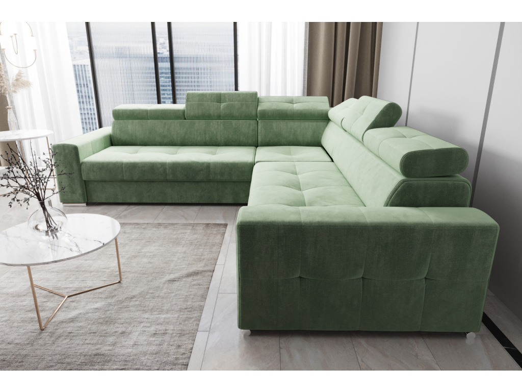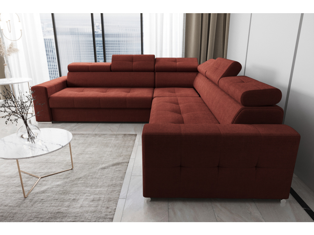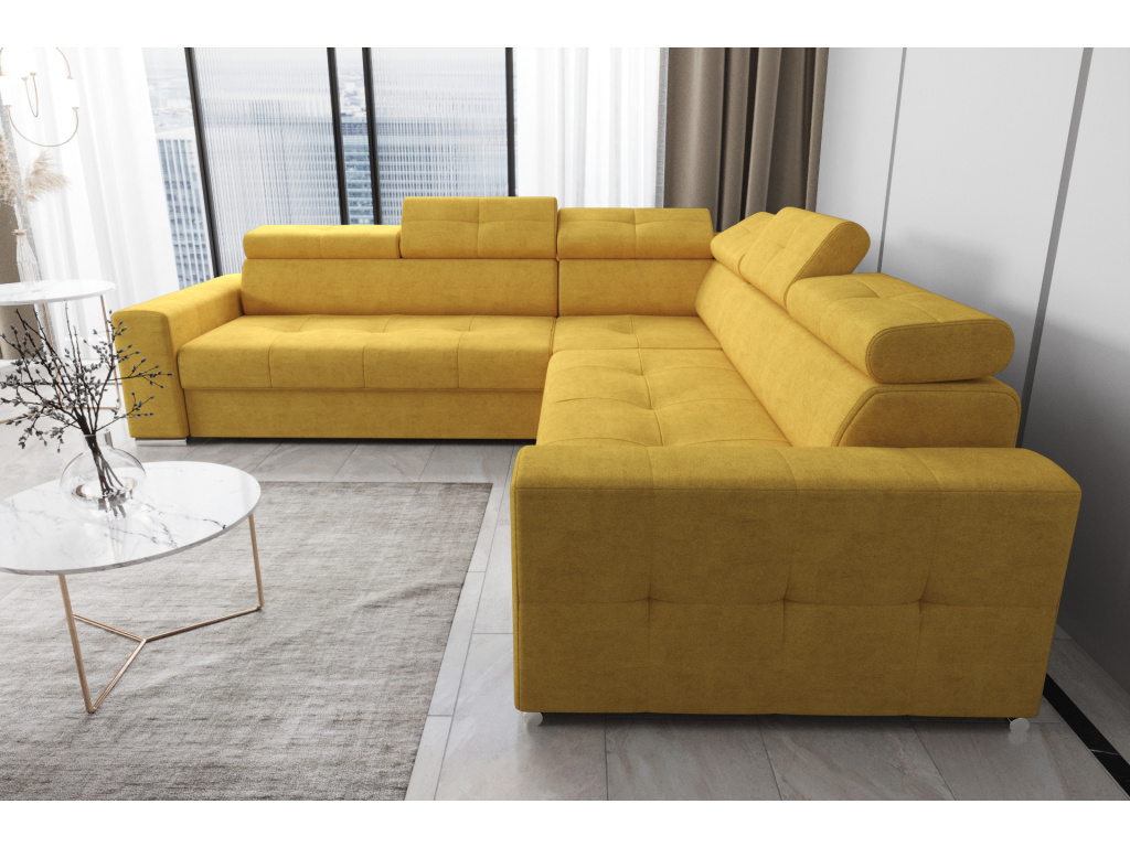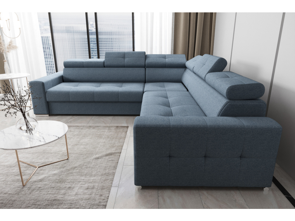 Rohová sedací souprava Margo Max 270 × 270 cm je ideální volbou pro ty, kteří hledají prostorný, elegantní a maximálně pohodlný nábytek do svého obývacího pokoje; její výrazné prošívání na sedácích, opěrkách hlavy a bočních panelech dodává sofistikovaný a luxusní vzhled, zatímco tvarované sedáky a nastavitelné opěrky hlavy umožňují individuální nastavení pro maximální komfort; praktická funkce rozkladu typu delfín snadno promění pohovku v prostorné lůžko pro hosty a integrovaná přihrádka z laminované desky poskytuje dodatečný úložný prostor pro ložní prádlo; kvalitní konstrukce z kombinace dřeva a dřevotřísky zajišťuje stabilitu a dlouhou životnost, sedáky s vlnitými pružinami a vysoce pružnou pěnou T35 a HR nabízejí optimální rovnováhu mezi měkkostí a oporou; soupravu si můžete přizpůsobit výběrem materiálu – od umělé kůže přes pleteniny, samet až po velur. Margo Max se tak stává stylovým, komfortním a praktickým středobodem každého obývacího pokoje, který kombinuje luxusní design s maximální funkčností.