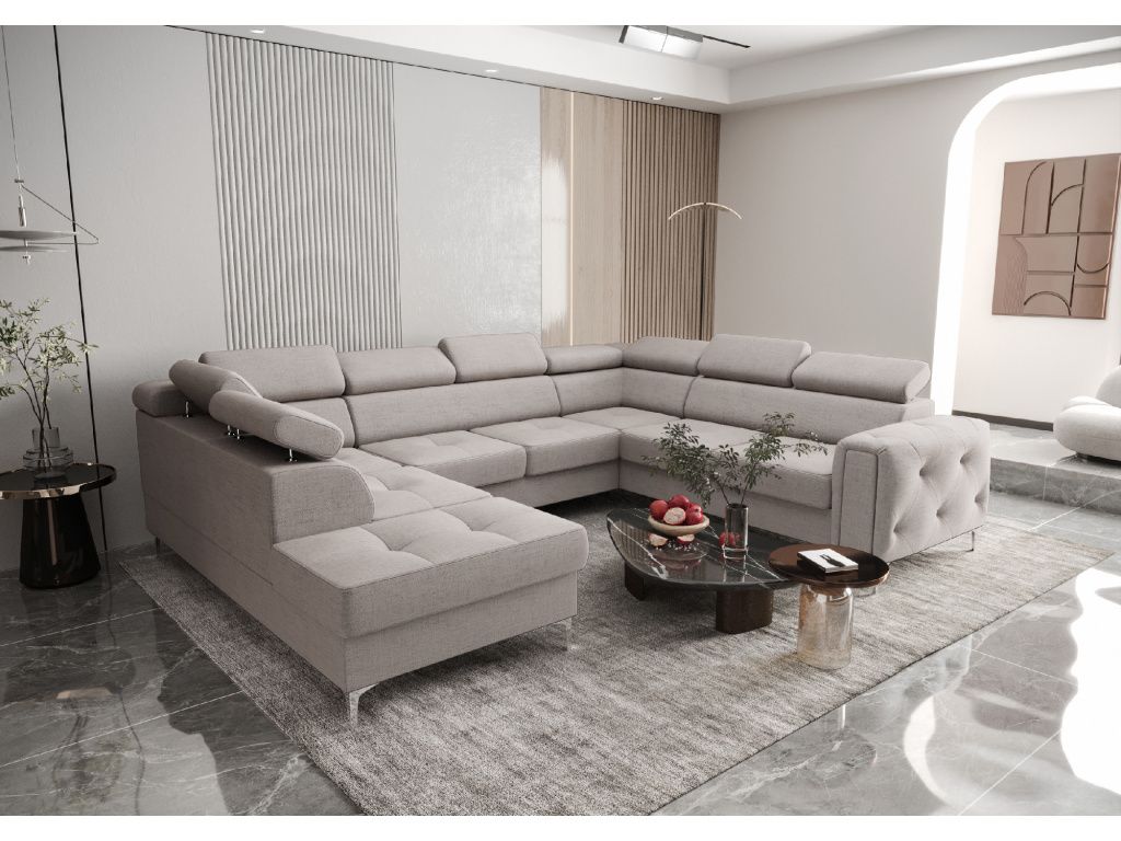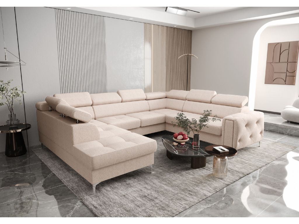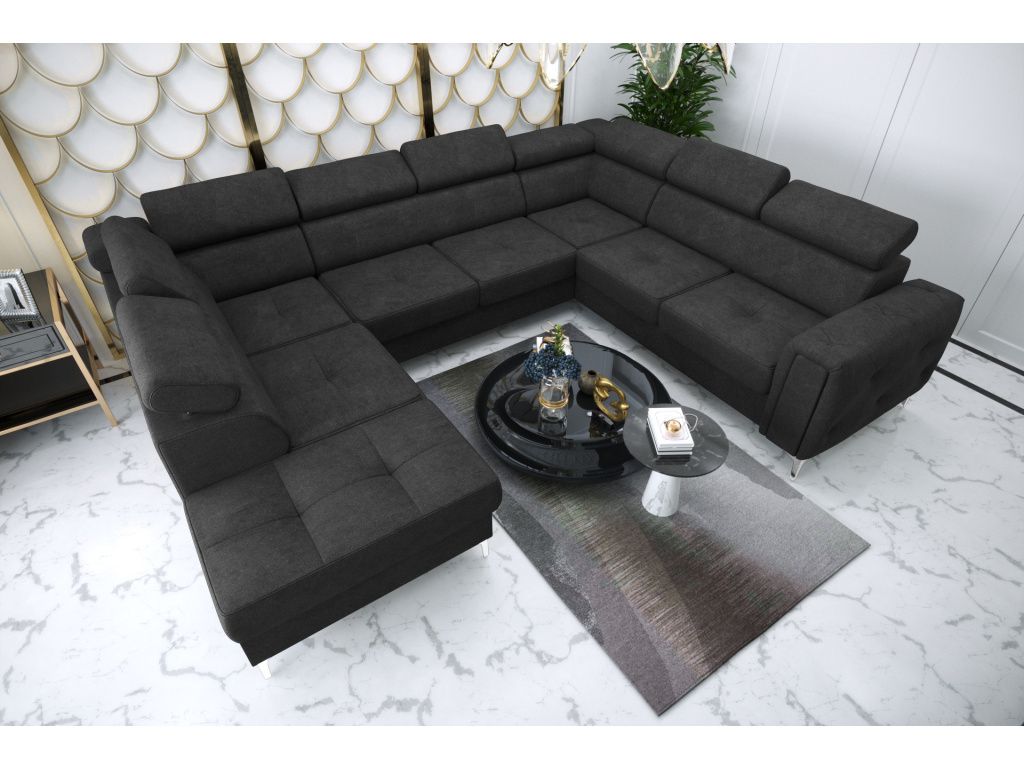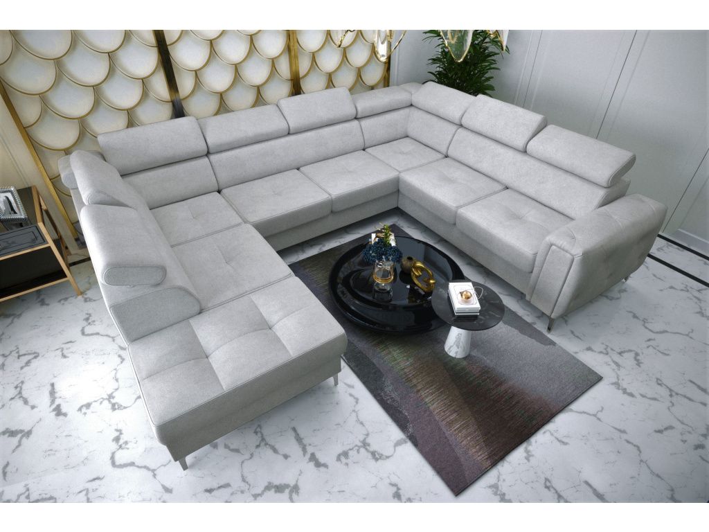 Rohová sedací souprava Orion Max I do U s funkcí spaní o rozměrech 225 × 350 × 255 cm je luxusní a mimořádně prostorný model z naší nejprodávanější kolekce, který spojuje elegantní design, maximální pohodlí a vysokou praktičnost, díky čemuž se stane dominantou každého obývacího pokoje; na první pohled zaujme stylovou prošívanou bočnicí, která dodává nábytku jedinečný charakter a podtrhuje jeho moderní vzhled, zatímco automatická delfínová funkce spaní umožňuje snadnou a rychlou přeměnu na pohodlné lůžko pro hosty, k dispozici jsou také dvě prostorné přihrádky na ložní prádlo z laminované desky, které poskytují praktický úložný prostor, nastavitelné opěrky hlavy včetně pevné rohové zajišťují maximální komfort při relaxaci a sedáky s vlnitými pružinami v kombinaci s vysoce pružnou pěnou T35 a HR nabízejí ideální rovnováhu mezi měkkostí a odolností; pevná konstrukce ze dřeva a dřevotřísky garantuje dlouhou životnost a stabilitu, zatímco dvě varianty 13 cm vysokých kovových nohou ve stříbrném nebo černém provedení podtrhují moderní vzhled a zároveň usnadňují úklid robotickými vysavači, celé provedení doplňuje precizní dekorativní prošívání zdůrazňující důraz na detail a kvalitu zpracování, a díky široké nabídce prémiových látek včetně sametu, eko kůže či žinylky si můžete sedací soupravu přizpůsobit přesně podle svých představ, přičemž všechny materiály jsou opatřeny ochrannými úpravami proti skvrnám, snadno se čistí a jsou vhodné i pro domácnosti s mazlíčky, což z Orion Max I činí ideální volbu pro ty, kteří hledají spojení stylu, komfortu a funkčnosti v jednom velkorysém řešení.