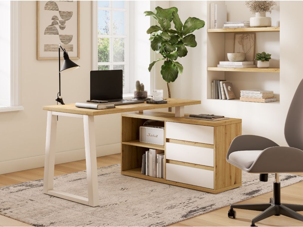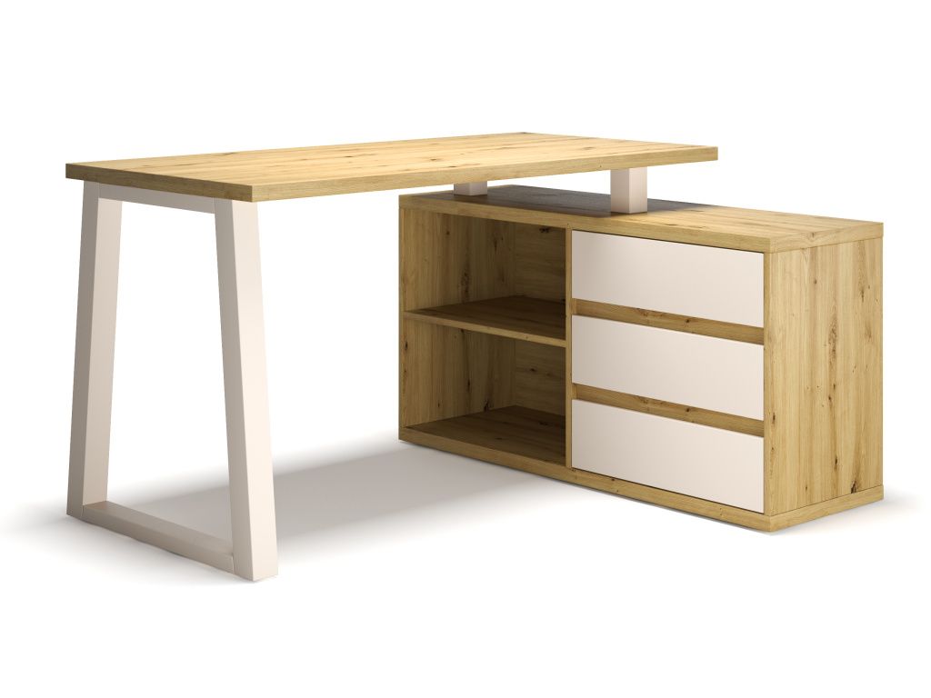 Rohový psací stůl IWO II je ideální do pokoje pro mládež, kanceláře nebo pracovny. Díky své rohové konstrukci se vejde i do malých místností. Nábytek je vybaven třemi zásuvkami a objemnou policí, které poskytují dostatek prostoru pro uložení kancelářských potřeb. Psací stůl IWO II je přizpůsobivý a univerzální kus nábytku, který jistě zapadne do většiny interiérů.