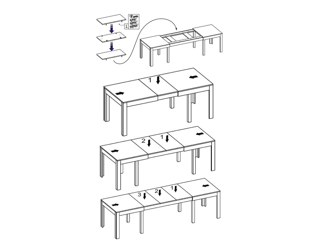 Hlavní výhodou tohoto stolu je jeho tři rozkládací vložky o šířce 47 cm, které umožňují rozšíření stolu na šířky 160 / 207 / 254 / 300 cm. Stůl je vybaven kolejovým systémem pro snadnější a plynulé rozkládání.