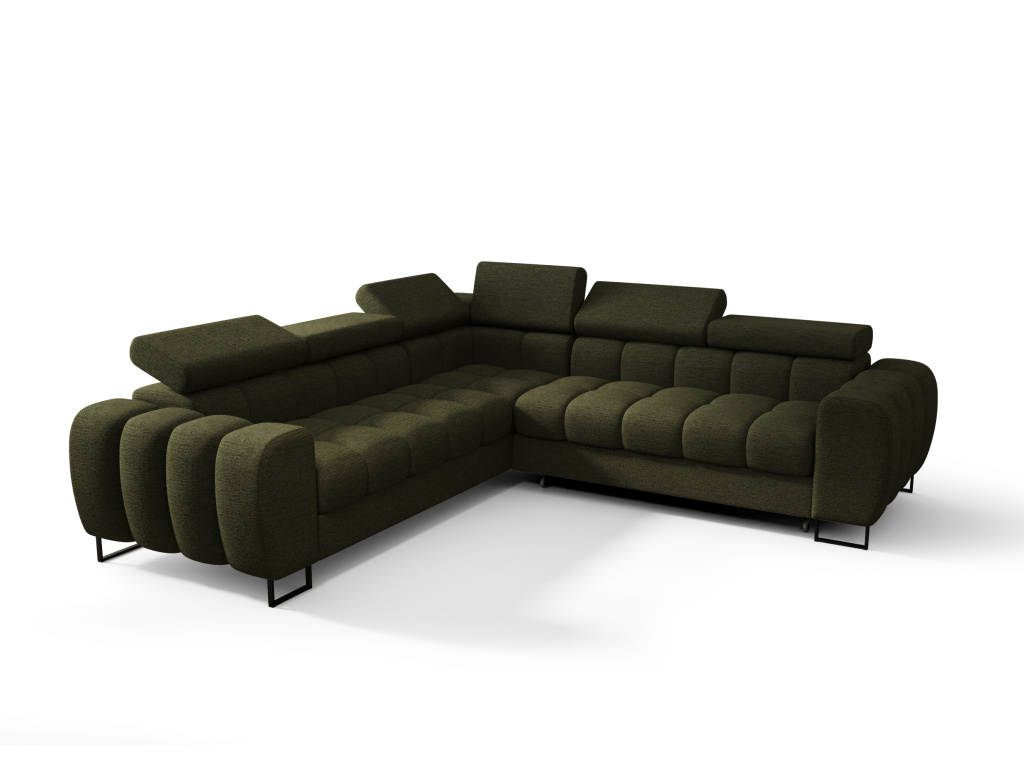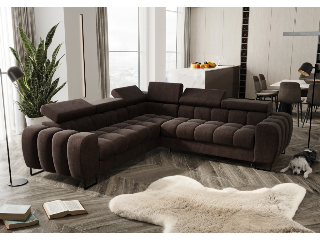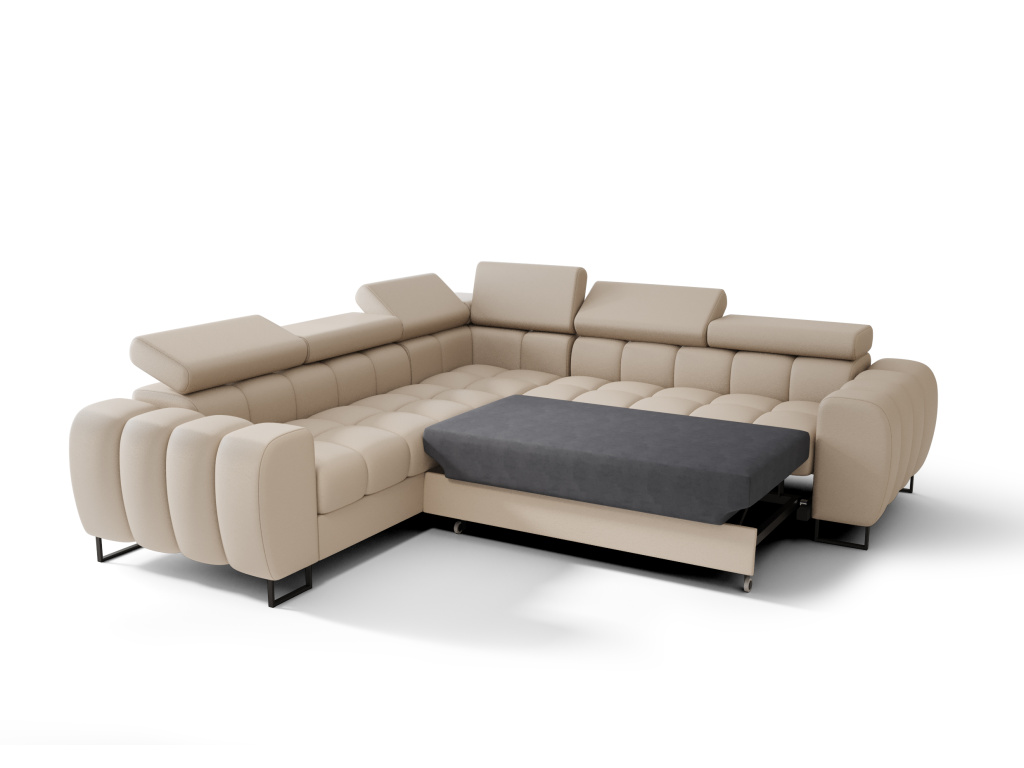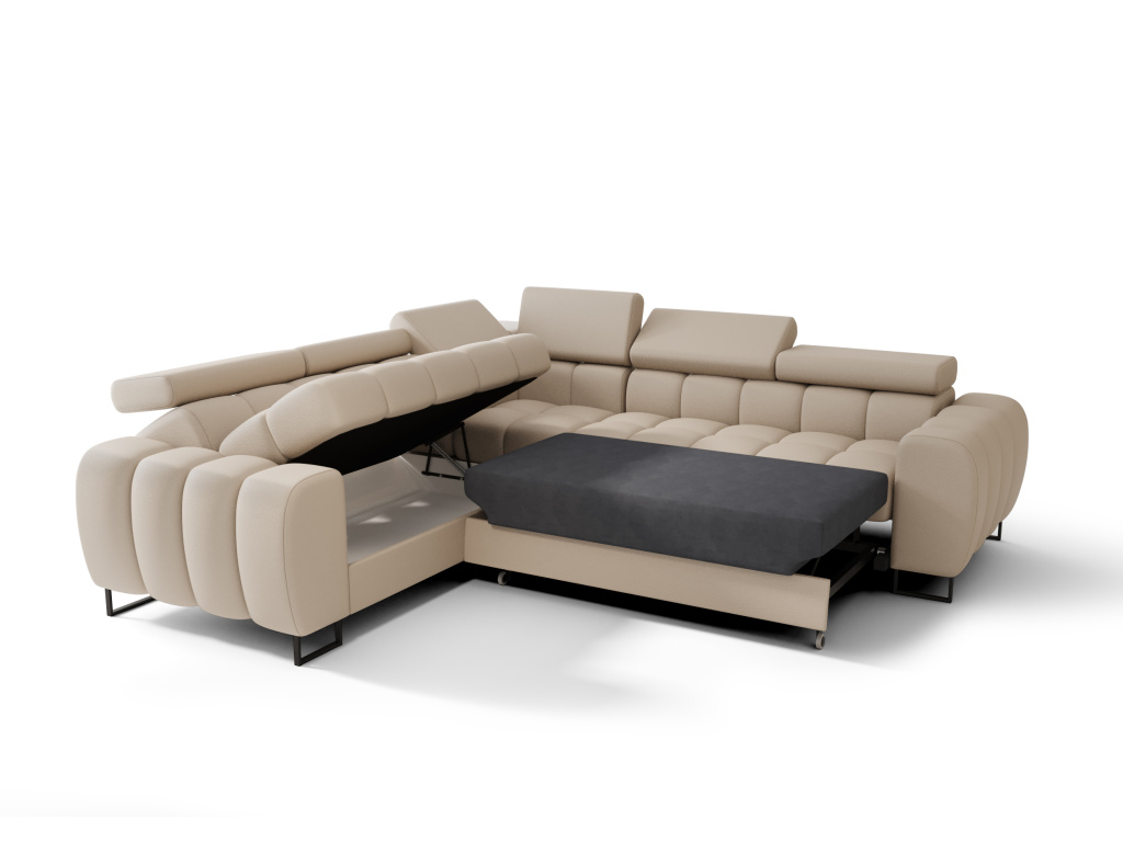 Rozkládací rohová pohovka Aspen Max je prostorná a elegantní verze oblíbeného modelu Aspen, která přináší ještě více komfortu, stylu a praktičnosti do vašeho obývacího pokoje. Díky rovnostrannému, symetrickému provedení působí harmonicky a vyváženě v každém interiéru, přičemž orientace rohu je určena umístěním praktického úložného prostoru na ložní prádlo. Během dne slouží jako velkorysá a pohodlná pohovka ideální pro odpočinek s rodinou nebo setkání s přáteli, zatímco večer ji snadno proměníte na příležitostné lůžko pro hosty. Nastavitelné opěrky hlavy umožňují přizpůsobit polohu přesně podle vašich potřeb, takže si vždy užijete maximální pohodlí při relaxaci, sledování televize nebo čtení. Charakteristický design inspirovaný tvarem čokoládové tyčinky dodává modelu Aspen Max originální vzhled, který okamžitě upoutá pozornost a vnese do interiéru moderní eleganci. Vysoké nohy ve stříbrném nebo černém provedení podtrhují stylový charakter pohovky a zároveň usnadňují úklid pod nábytkem. Široká nabídka kvalitních čalounických látek v různých barvách a texturách vám umožní vytvořit pohovku přesně podle vašeho vkusu, přičemž všechny materiály jsou pečlivě vybírány tak, aby byly odolné, snadno se čistily, chránily před politím a byly vhodné i do domácností s domácími mazlíčky. Aspen Max je ideální volbou pro ty, kteří hledají moderní, praktickou a pohodlnou rohovou pohovku, která se stane stylovým centrem jejich domova.