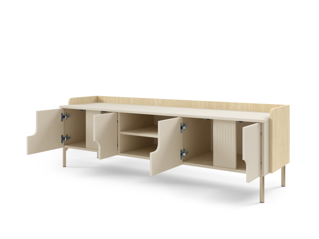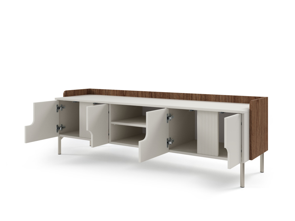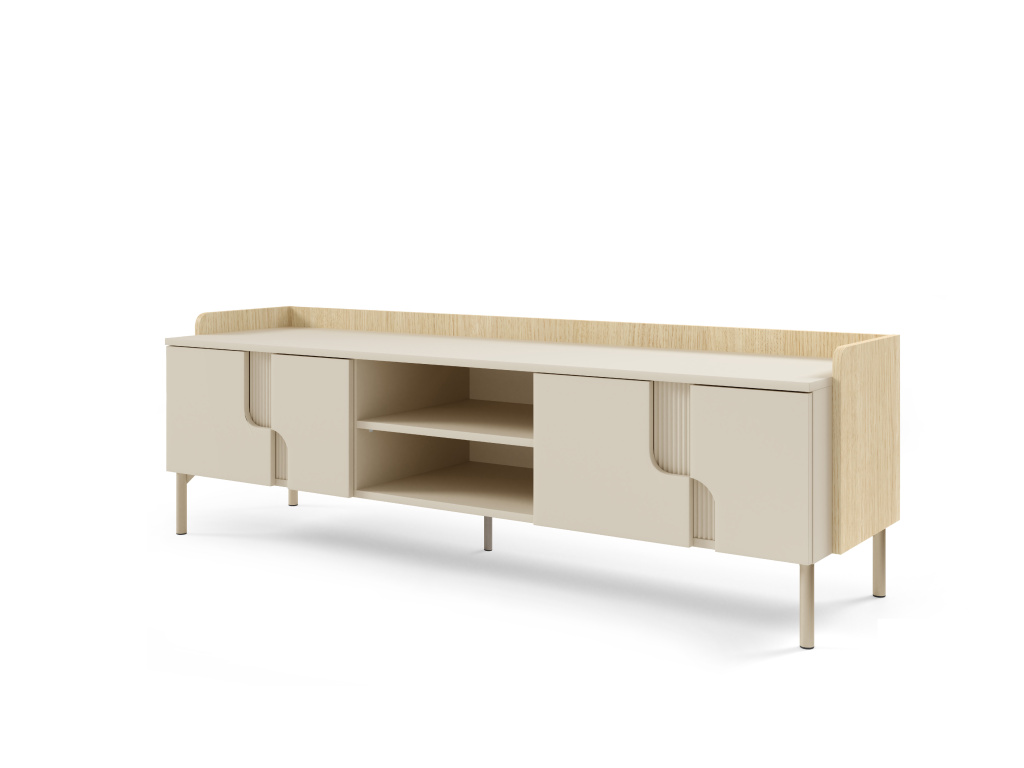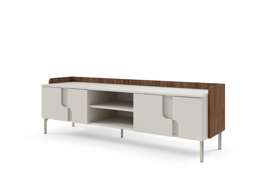 RTV stolek POSITANO se čtyřmi dvířky a policí na DVD nabízí velkorysý úložný prostor a elegantní řešení pro moderní obývací pokoj. Kvalitní ABS dýha zajišťuje vysokou odolnost povrchu proti poškrábání, snadnou údržbu a dlouhou životnost i při každodenním používání. Promyšlené uspořádání poskytuje dostatek místa pro televizi, elektroniku, DVD i další příslušenství, zatímco uzavřený prostor pomáhá udržet interiér přehledný a uklizený. Díky čistým liniím, stabilní konstrukci a nadčasovému designu se stolek snadno kombinuje s ostatním nábytkem kolekce POSITANO a skvěle zapadne do každého moderního interiéru. Dostupné barevné kombinace: dub mavelie + makadamie, kašmír + ořech alba.