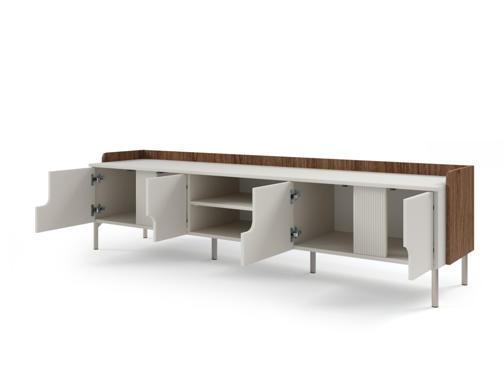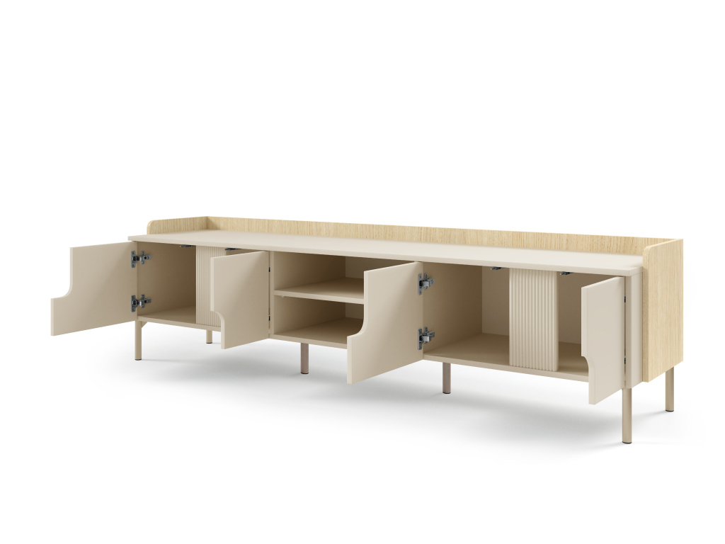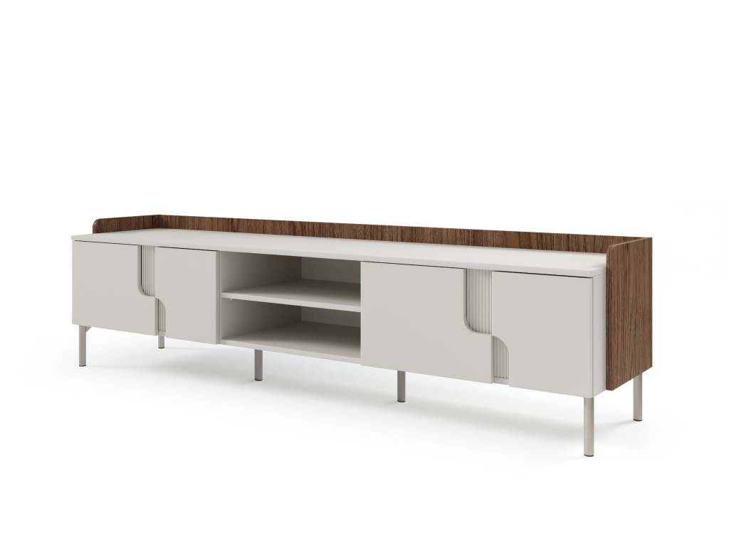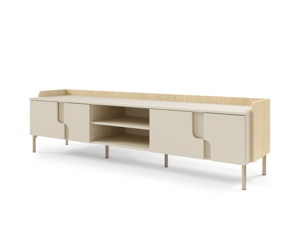 RTV stolek POSITANO o šířce 200 cm se čtyřmi dvířky a policí na DVD je ideální volbou pro prostornější obývací pokoj, kde poskytne dostatek místa pro televizor, elektroniku i další příslušenství. Kvalitní ABS dýha zajišťuje vysokou odolnost povrchu proti poškrábání, snadnou údržbu a dlouhou životnost při každodenním používání. Promyšlené vnitřní uspořádání nabízí přehledný úložný prostor, zatímco uzavřená dvířka pomáhají udržet interiér čistý a organizovaný. Díky čistým liniím, stabilní konstrukci a nadčasovému designu se stolek snadno kombinuje s ostatním nábytkem kolekce POSITANO a přirozeně zapadne do moderního interiéru. Dostupné barevné kombinace: dub mavelie + makadamie, kašmír + ořech alba.