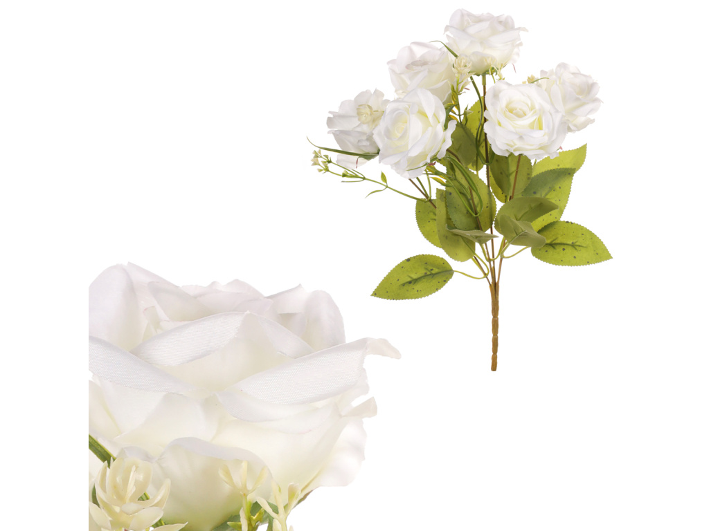 Kytice umělých růží s bílou barvou květů bude působivou květinovou dekorací. Její krása časem neuvadne a můžete tak využívat tuto umělou květinu opakovaně, nebo ji mít jako trvalou ozdobu. Vynikne sama o sobě v pěkné váze, nebo může být součástí ucelené květinové výzdoby pro různé oslavy, či jiné společenské události. Nemusíte si dělat starosti s údržbou a zaléváním, neboť jako umělá, nepotřebuje žádnou péči, a přitom vypadá fantasticky. Je věrohodnou kopií živé varianty, a tak při letmém pohledu na ní, ji ani nerozeznáte od originálu.Buďte první, kdo napíše příspěvek k této položce.