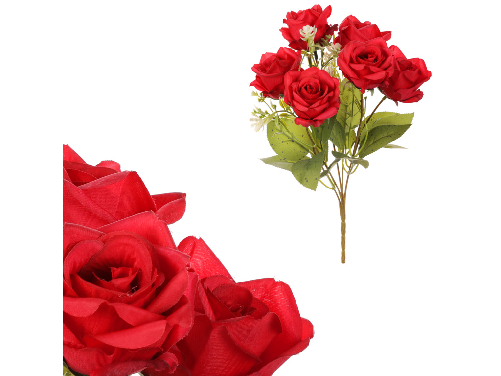 Kytice umělých růží s červenou barvou květů bude působivou květinovou dekorací. Její krása časem neuvadne a můžete tak využívat tuto umělou květinu opakovaně, nebo ji mít jako trvalou ozdobu. Vynikne sama o sobě v pěkné váze, nebo může být součástí ucelené květinové výzdoby pro různé oslavy, či jiné společenské události. Nemusíte si dělat starosti s údržbou a zaléváním, neboť jako umělá, nepotřebuje žádnou péči, a přitom vypadá fantasticky. Je věrohodnou kopií živé varianty, a tak při letmém pohledu na ní, ji ani nerozeznáte od originálu.Buďte první, kdo napíše příspěvek k této položce.