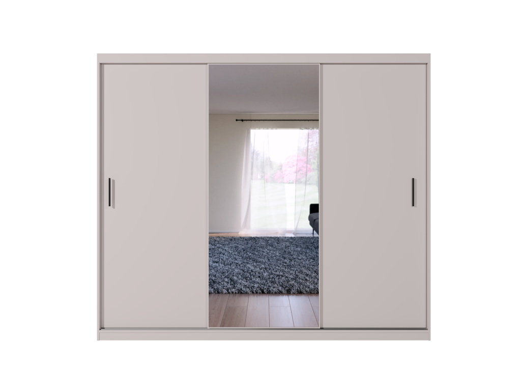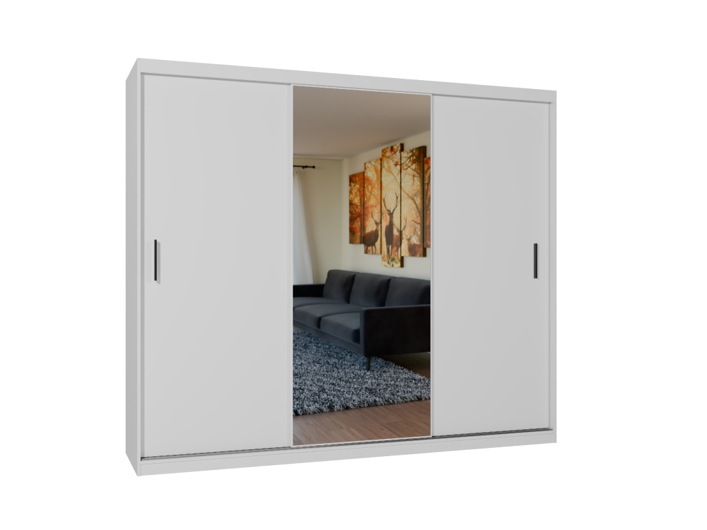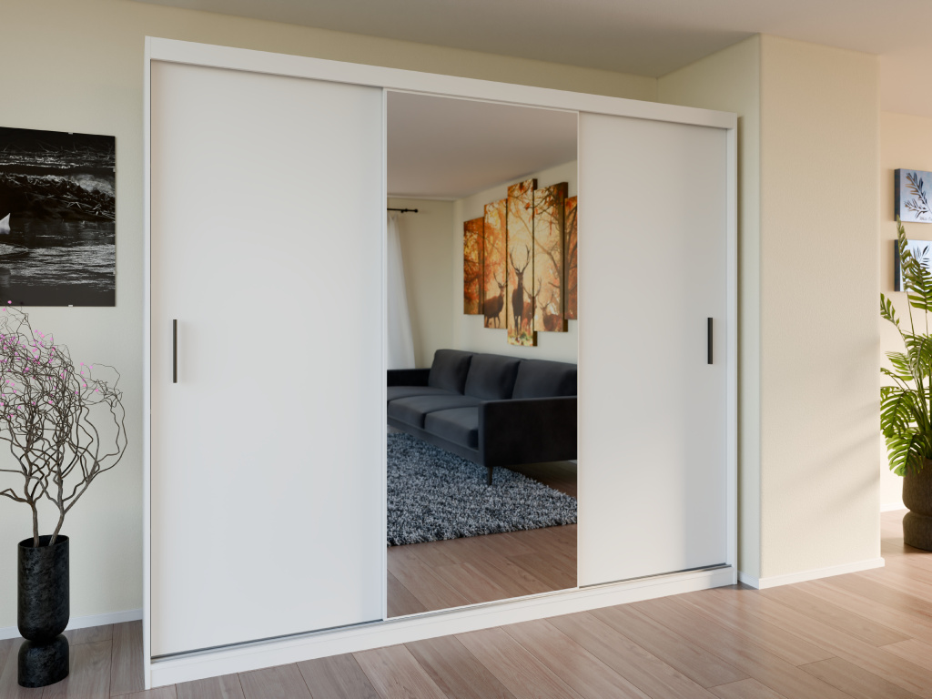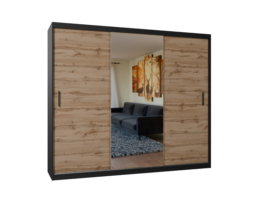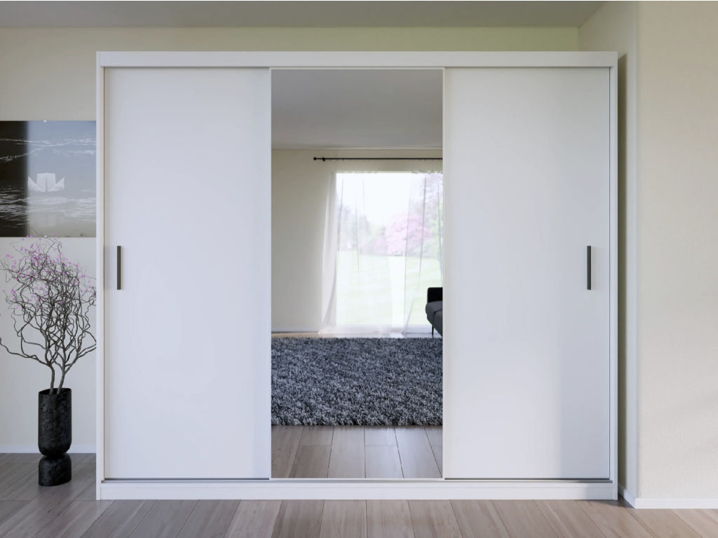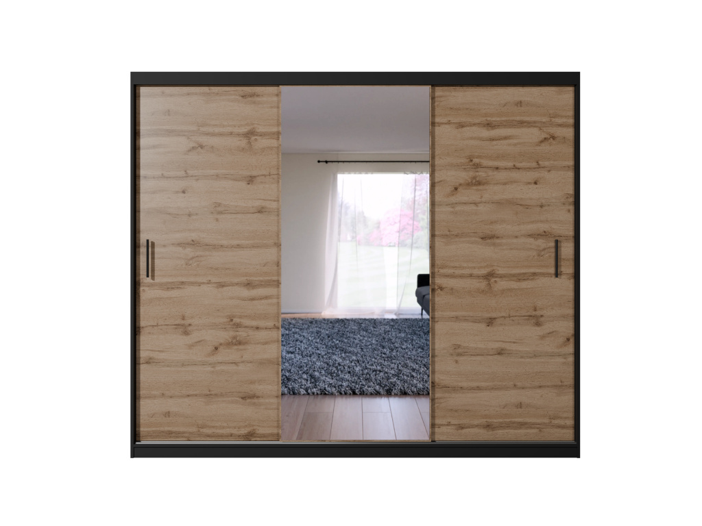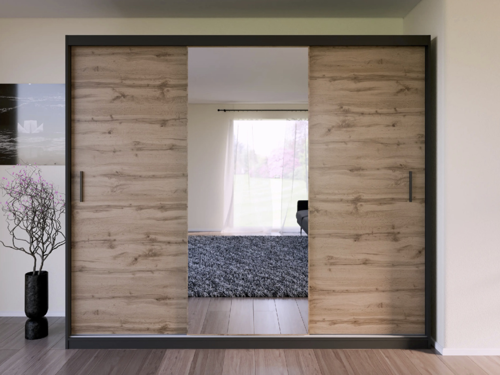 Šatní posuvná skříň Bregi o rozměrech 250 × 60 × 215 cm je ideální volbou pro ty, kteří hledají maximální úložný prostor, moderní vzhled a praktické řešení do prostornější ložnice, díky posuvným dveřím šetří místo a zajišťuje pohodlný přístup k celému obsahu, integrované zrcadlo opticky zvětší a prosvětlí místnost a elegantní úchytky podtrhují její stylový charakter, pevná konstrukce z kvalitní 16mm nábytkové desky v kombinaci se zadní HDF deskou o tloušťce 3 mm garantuje stabilitu a dlouhou životnost, na výběr jsou nadčasové barevné varianty bílý, kašmír nebo moderní kombinace černý/Wotan, díky nimž snadno sladíte skříň s jakýmkoli interiérem, Bregi představuje dokonalé spojení designu, funkčnosti a výhodné ceny pro náročné zákazníky.