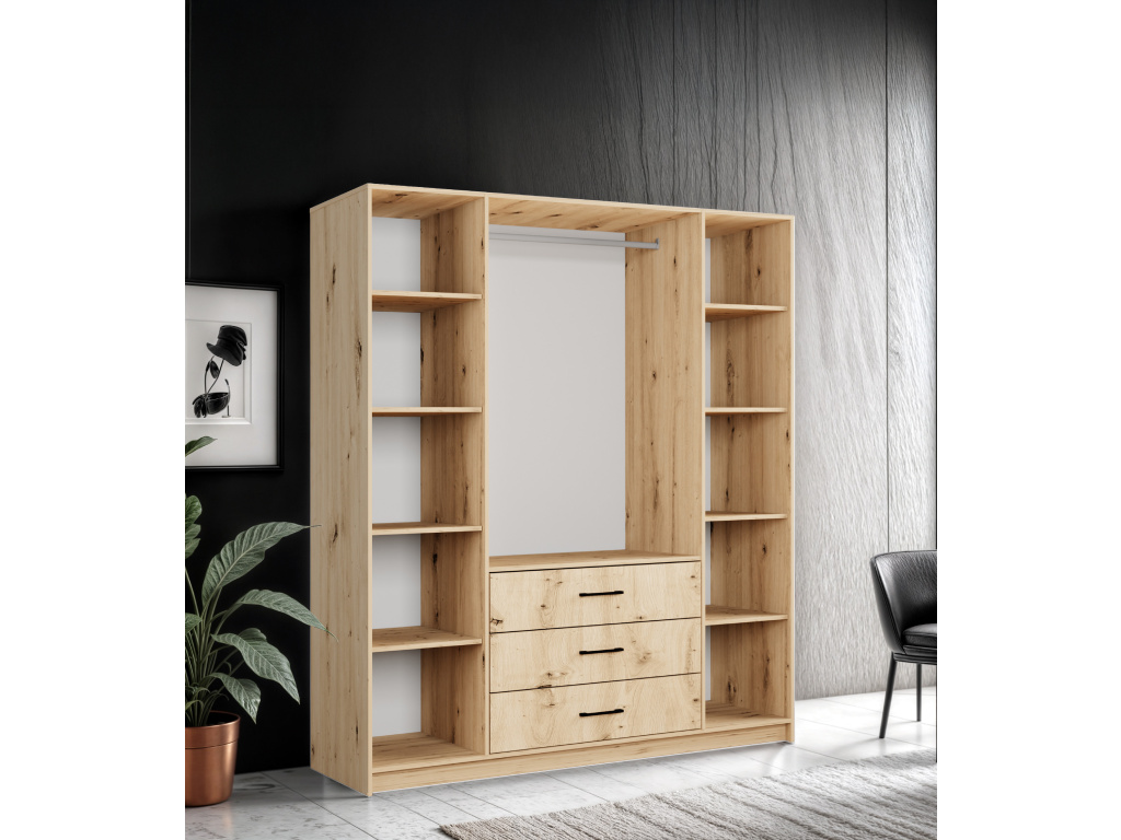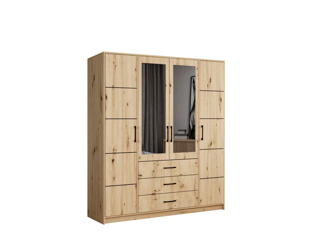 Šatní skříň Bella 200 v moderním provedení Dub artisan je elegantním a praktickým řešením pro každý interiér, nabízí velkorysý úložný prostor, stylové zrcadlo pro každodenní využití, tři prostorné šuplíky pro přehledné uložení drobností a černé úchyty, které podtrhují její současný design a dodávají skříni výrazný a luxusní vzhled.