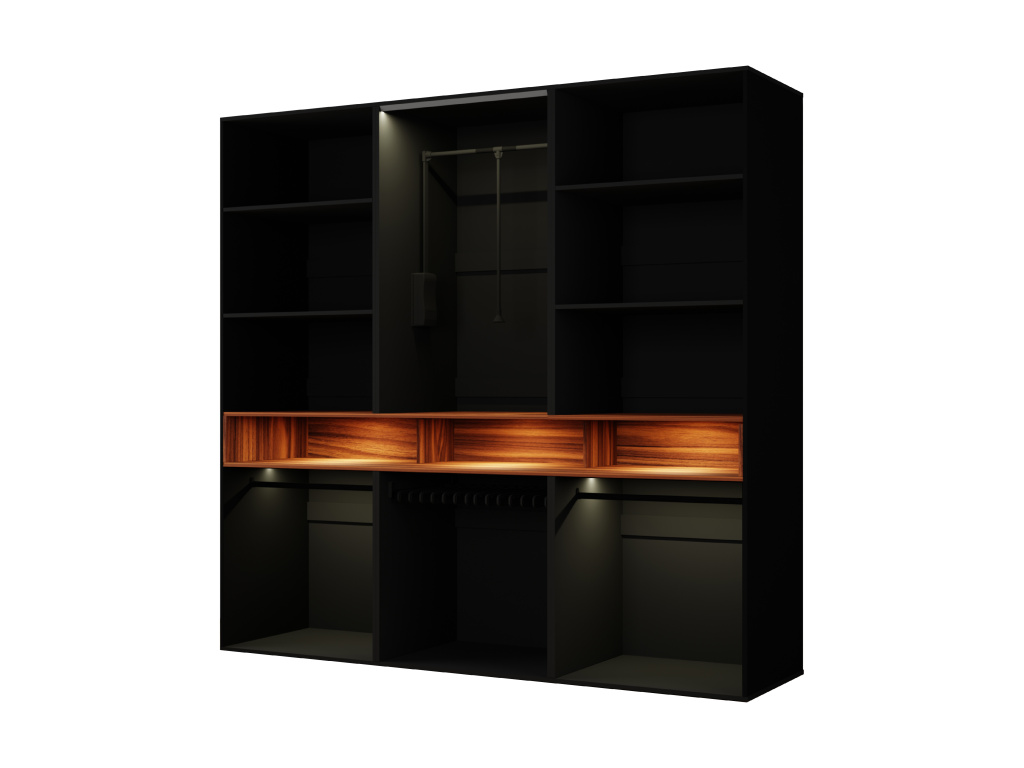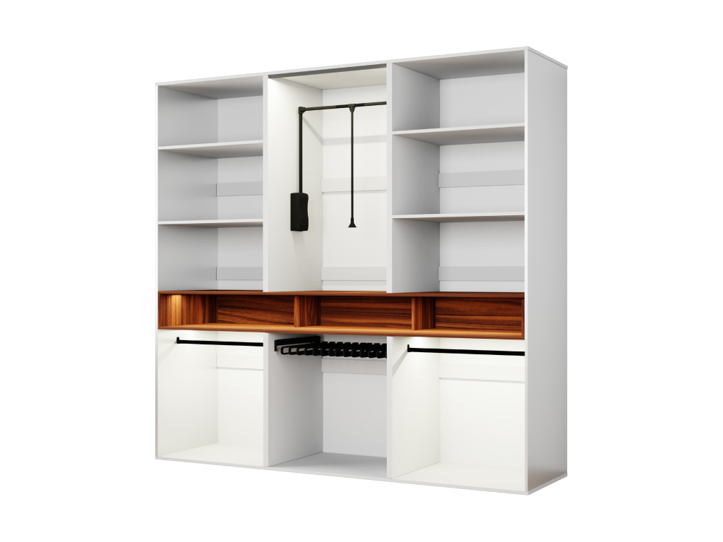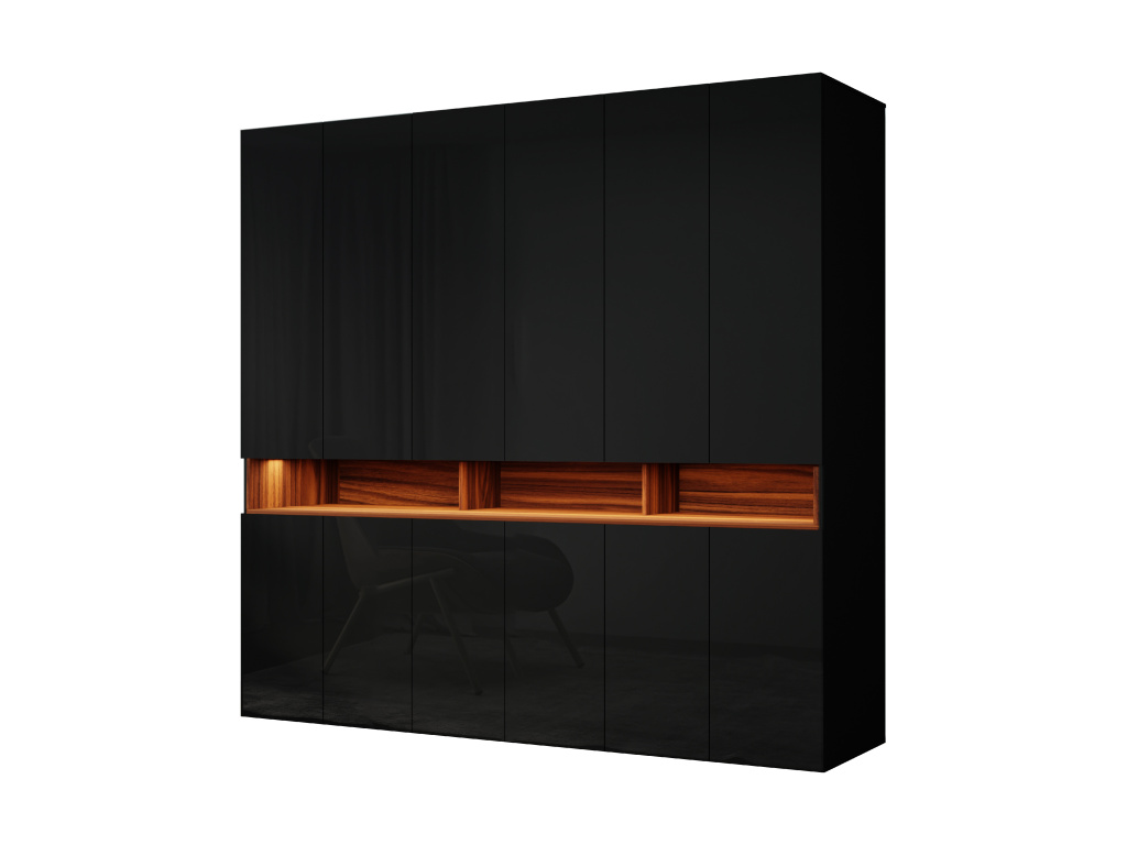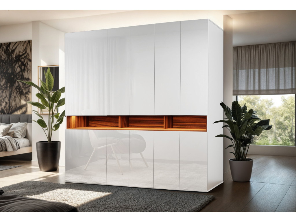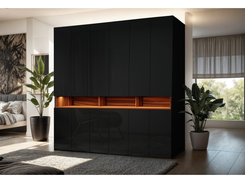 Šatní skříň Laura je výjimečným designovým i funkčním řešením pro moderní interiér, díky rozměrům 240 × 240 × 60 cm nabízí maximální úložný prostor a působí jako dominantní prvek místnosti, možnost výběru z barev bílá, černá, lesklá bílá nebo lesklá černá pro korpus i čelní části umožňuje dokonalé sladění s interiérem, výklopné dveře zajišťují pohodlný přístup k obsahu skříně, ozdobný výklenek a věšák na kabáty zvyšují praktičnost i estetiku, zatímco LED osvětlení a pantograf přinášejí komfort, přehlednost a luxusní dojem při každodenním používání.