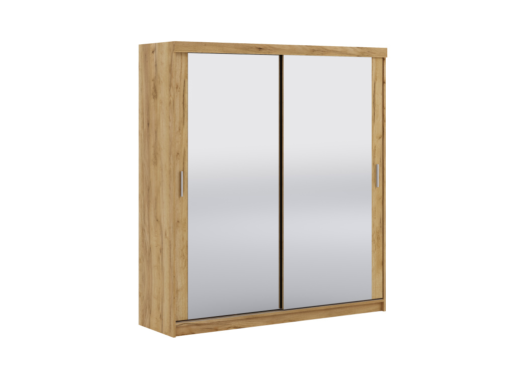 Šatní posuvná skříň LEXY v dekoru zlatý dub craft je elegantním a praktickým řešením pro každý moderní interiér, kombinuje plné posuvné dveře se dvěma zrcadly, která opticky zvětšují prostor a zvyšují komfort každodenního používání, díky rozměrům 200 × 217 × 62 cm nabízí dostatek úložného místa pro oblečení i doplňky a posuvný systém dveří šetří místo a zajišťuje pohodlnou manipulaci.