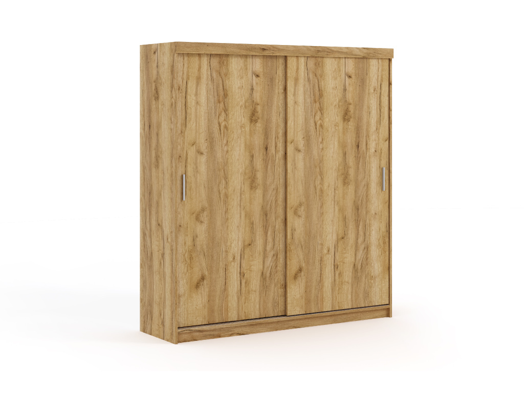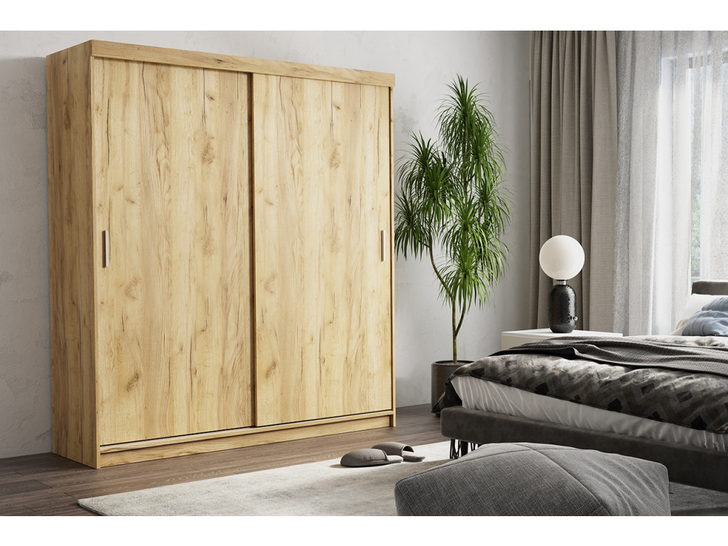 Šatní posuvná skříň LEXY je moderním a praktickým řešením úložného prostoru, vyniká čistým designem s plnými posuvnými dveřmi v atraktivním dekoru zlatý dub craft, který dodá interiéru teplo a přirozený vzhled, díky rozměrům 200 × 217 × 62 cm nabízí dostatek místa pro přehledné uložení oblečení i doplňků a posuvný systém dveří zajišťuje pohodlné používání i v menších místnostech.
