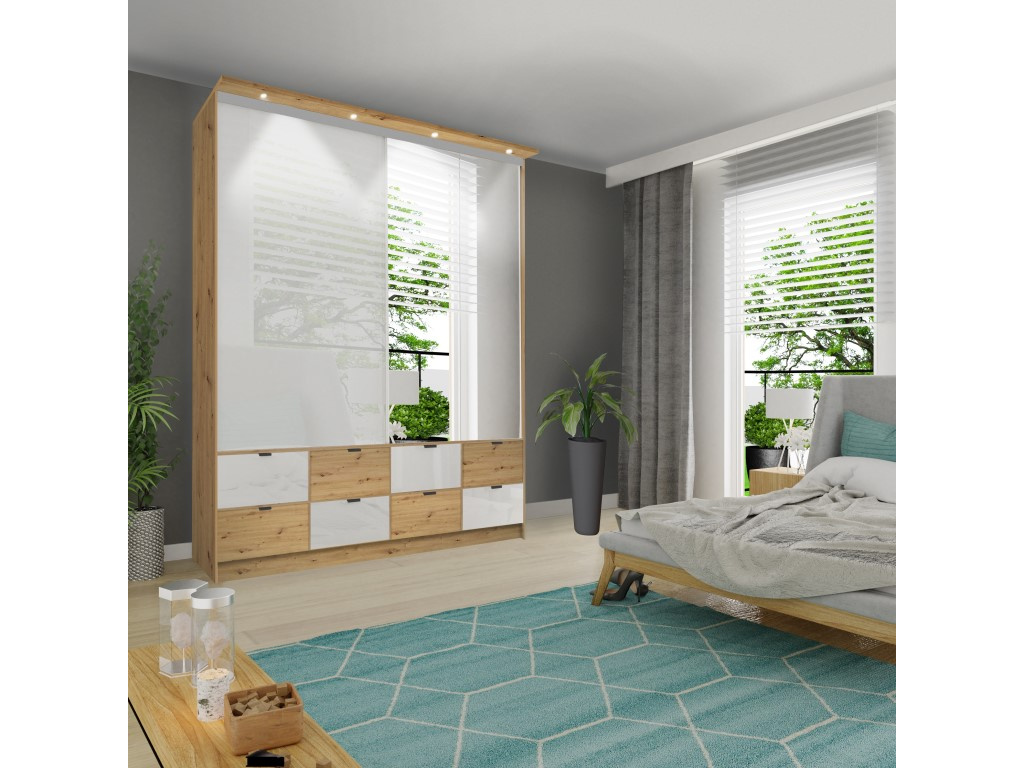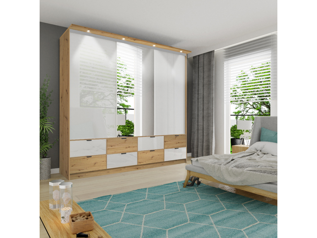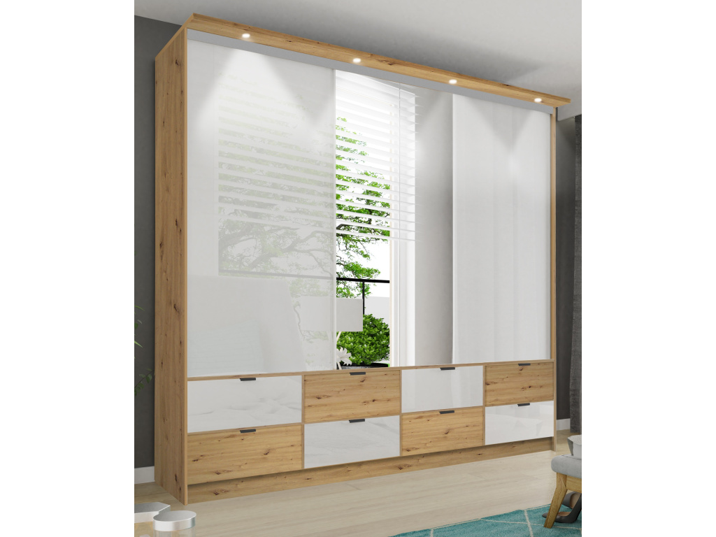 Skříň MALAGA je prémiovým řešením pro náročné zákazníky, kteří hledají maximální úložný prostor i moderní design, díky rozměrům 200 nebo 250 cm na šířku, výšce 243 cm a hloubce 60 cm, případně 70 cm s krytem, skvěle využívá prostor až ke stropu, korpus v dekoru Artisan působí teple a přirozeně, zatímco kombinace lesklé bílé, Artisan dekoru a zrcadla na čelních plochách dodává skříni luxusní a nadčasový vzhled, posuvné dveře šetří místo v interiéru, praktické zásuvky a pantograf zajišťují maximální komfort při používání a standardní osvětlení zvýrazňuje vnitřní prostor i celkový design skříně.
