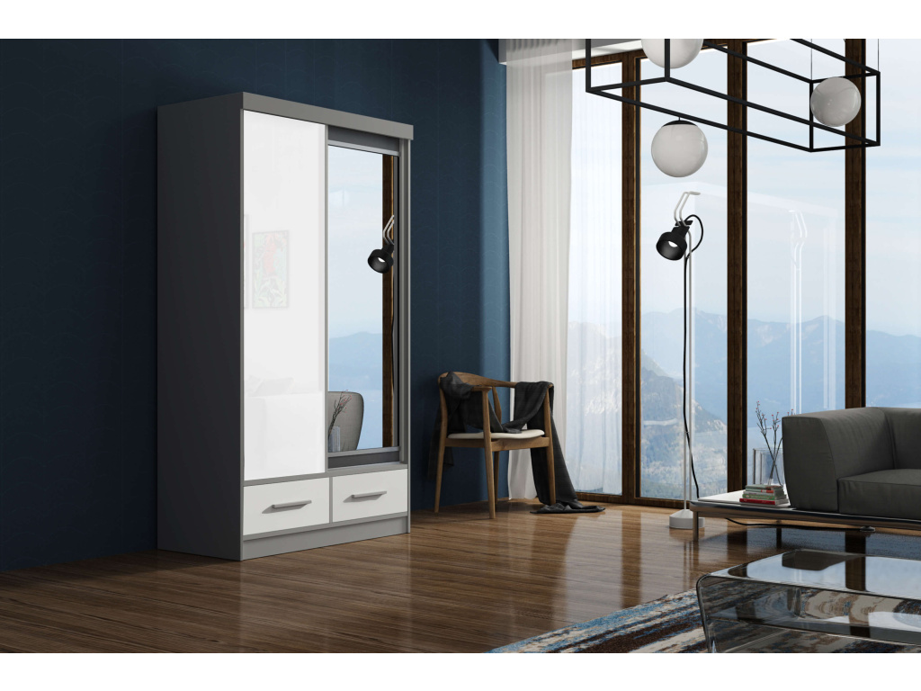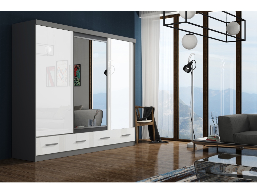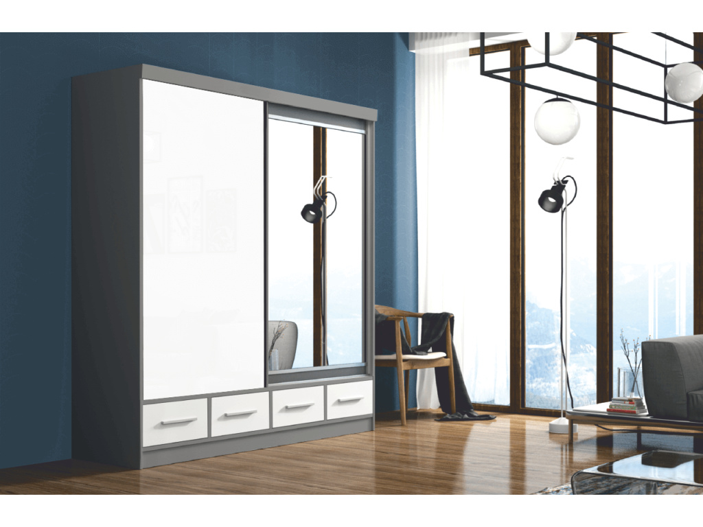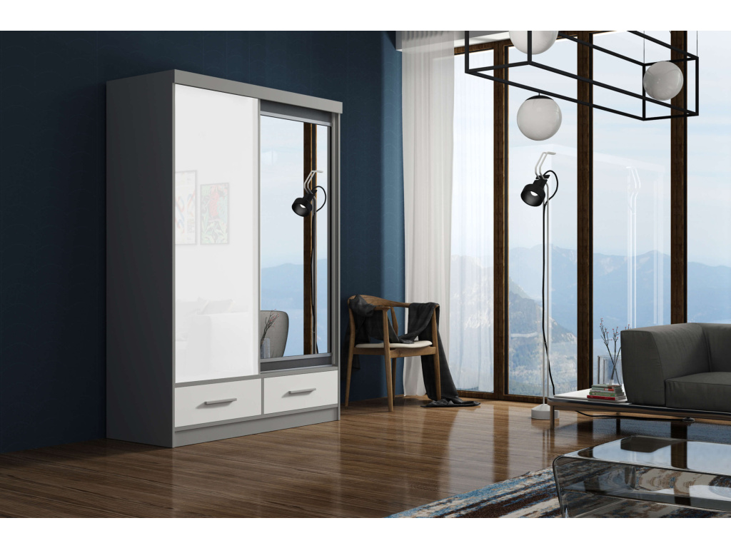 Šatní skříň Milena je elegantním a variabilním řešením pro moderní interiér, nabízí výběr ze čtyř šířek 120, 150, 200 a 250 cm při jednotných rozměrech výšky 216 cm a hloubky 62 cm, je dostupná v nadčasové šedobílé barvě a díky posuvným dveřím se zrcadlem a prvky Lacobel působí luxusním a čistým dojmem, promyšlené vnitřní vybavení v podobě zásuvek a vložek zajišťuje maximální přehlednost, zatímco stříbrné úchytky elegantně doplňují celkový design.