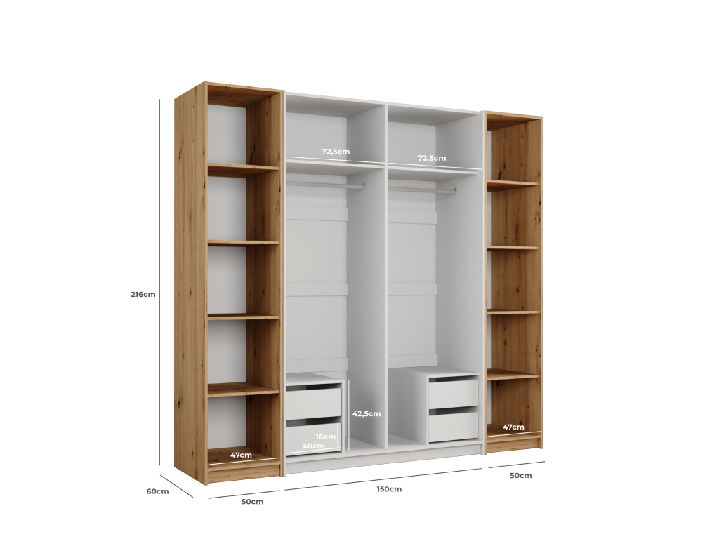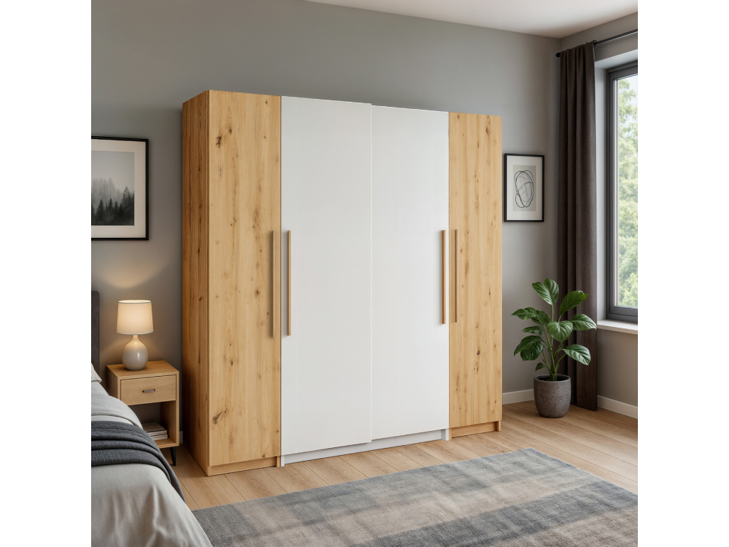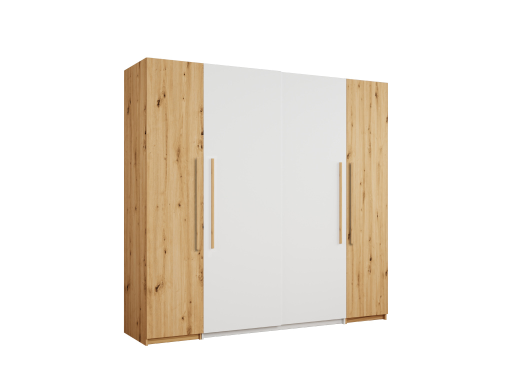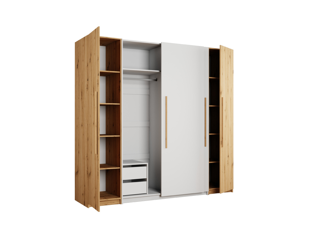 Šatní skříň Modena je elegantním a prostorným řešením pro moderní ložnici, díky rozměrům 250 × 216 × 60 cm nabízí velkorysý úložný prostor pro přehledné uspořádání oblečení i doplňků, stylová kombinace barev votan a bílá na korpusu i čelních plochách působí nadčasově a svěže, přičemž dřevodekor votan dodává interiéru teplo a přirozený charakter a bílá barva celkový vzhled krásně odlehčuje.