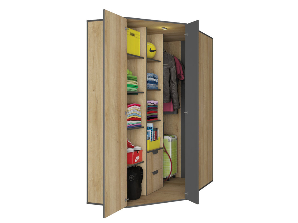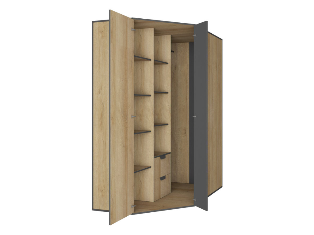 Šatní skříň Nano, grafit/dub riviéra, je dokonalým řešením pro každou ložnici nebo dětský pokoj. Tato skříň nejenže optimálně využije nevyužité kouty místnosti, ale také poskytne dostatek úložného prostoru pro veškeré oblečení a výstroj. Je to skvělý způsob, jak udržet místo uklizené a organizované, zatímco dodává místnosti moderní a elegantní vzhled. Šatní skříň Nano je vyrobena z vysoce kvalitní LTD desky v barevném provedení grafit/dub riviéra.