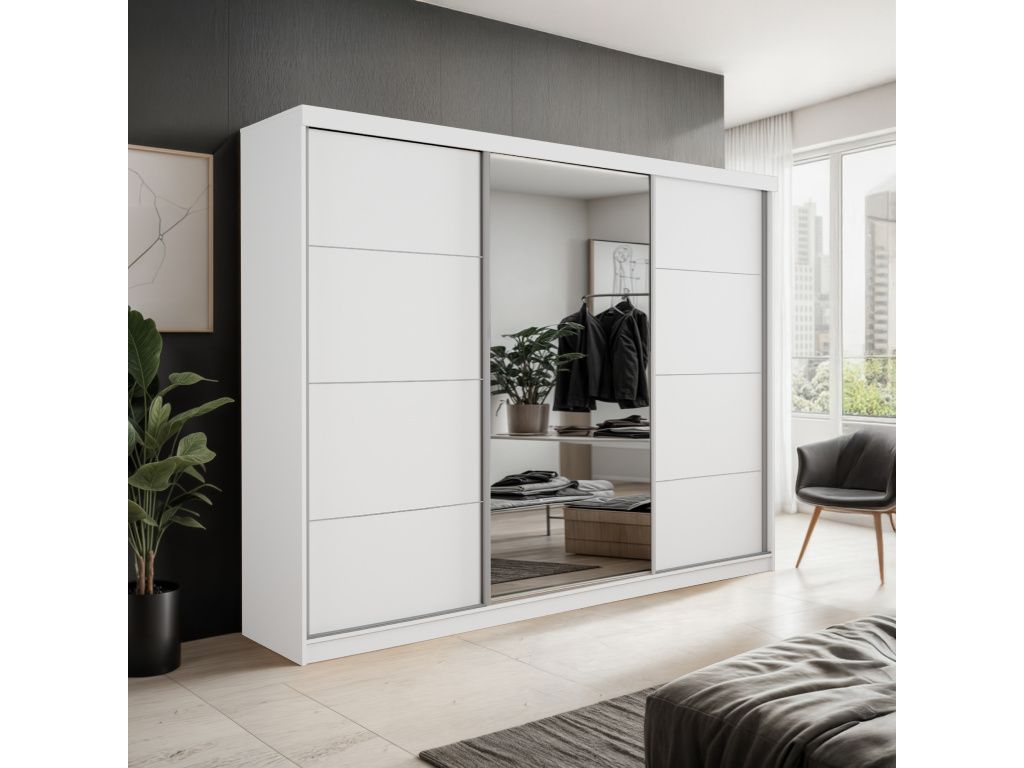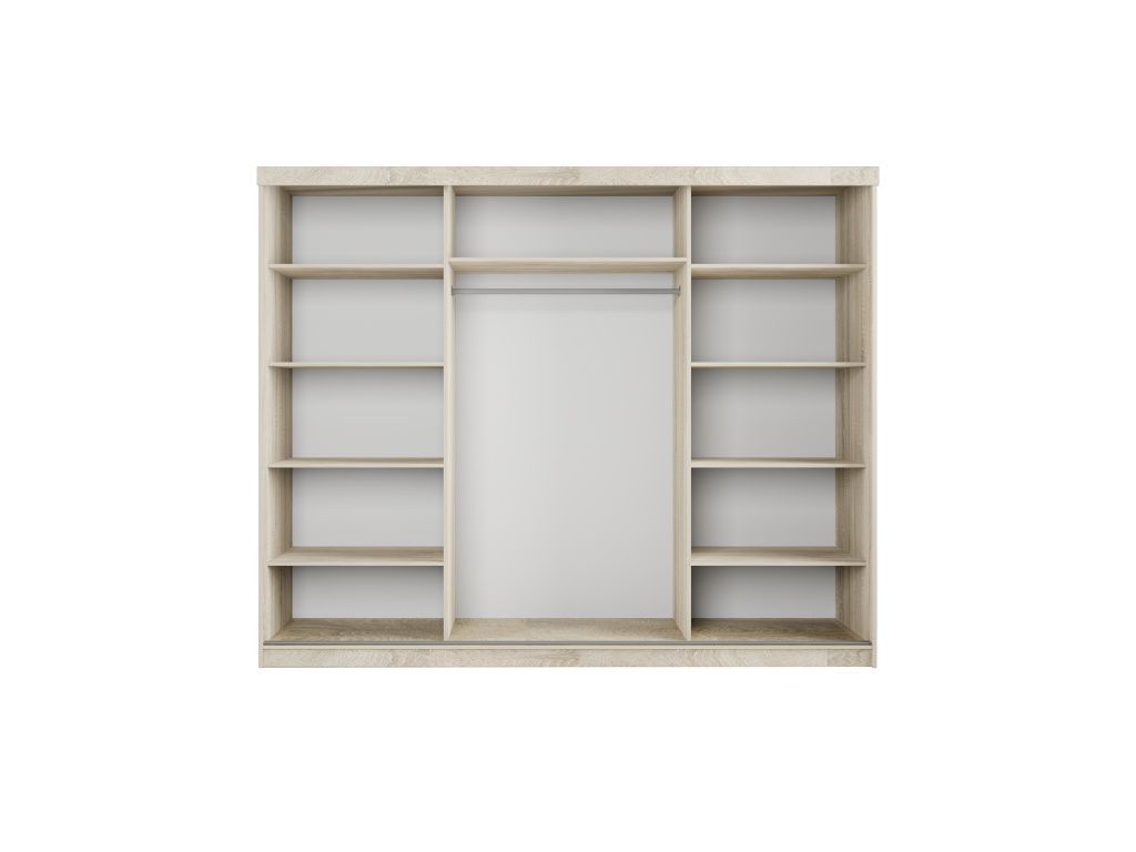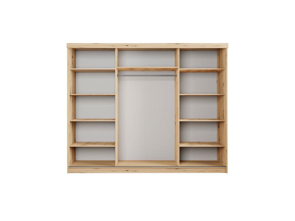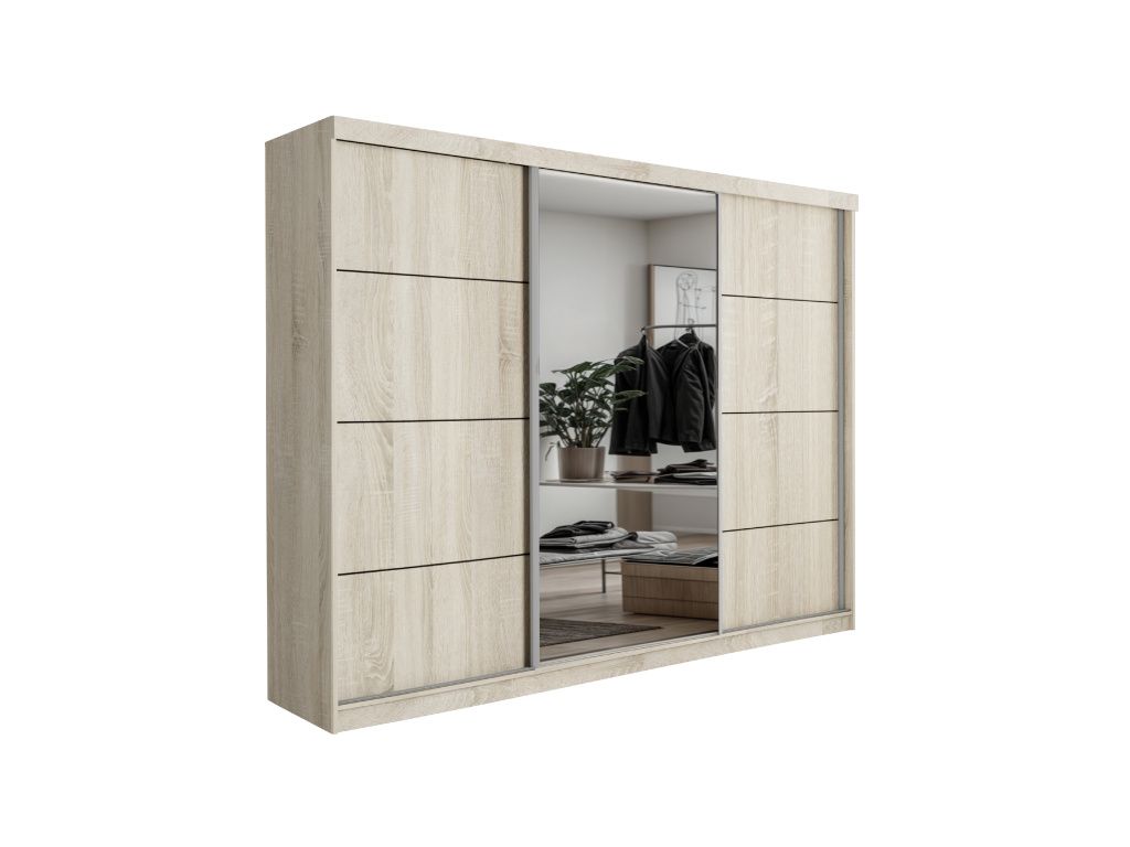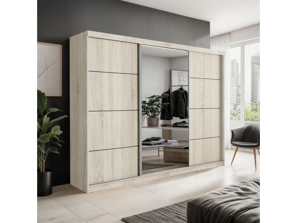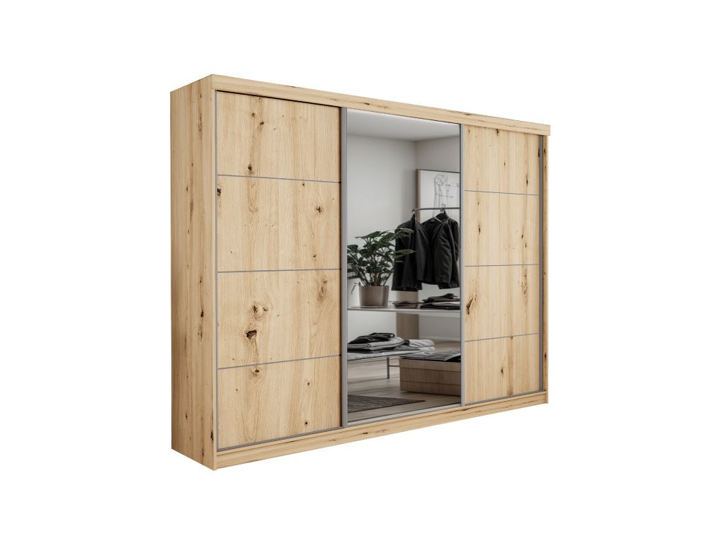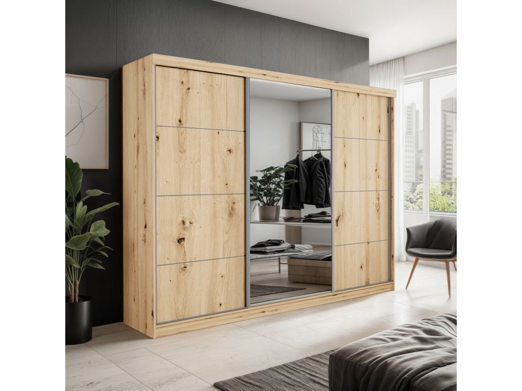 Šatní skříň PALMA 250 s posuvnými dveřmi a elegantním zrcadlem je ideálním řešením pro ty, kteří hledají kombinaci moderního designu, praktičnosti a dostatku úložného prostoru, díky své šířce 250 cm nabízí velkorysý prostor pro přehledné uspořádání oblečení i doplňků, zatímco posuvné dveře šetří místo a zajišťují pohodlné každodenní používání, integrované zrcadlo opticky zvětšuje prostor a dodává interiéru vzdušnost i eleganci, kvalitní zpracování zaručuje dlouhou životnost a stabilitu, moderní barevná provedení Artisan, Sonoma, Bílá a Kašmír umožňují snadné sladění s jakýmkoliv interiérem, což ze skříně PALMA 250 činí stylový a funkční prvek každé ložnice či šatny.