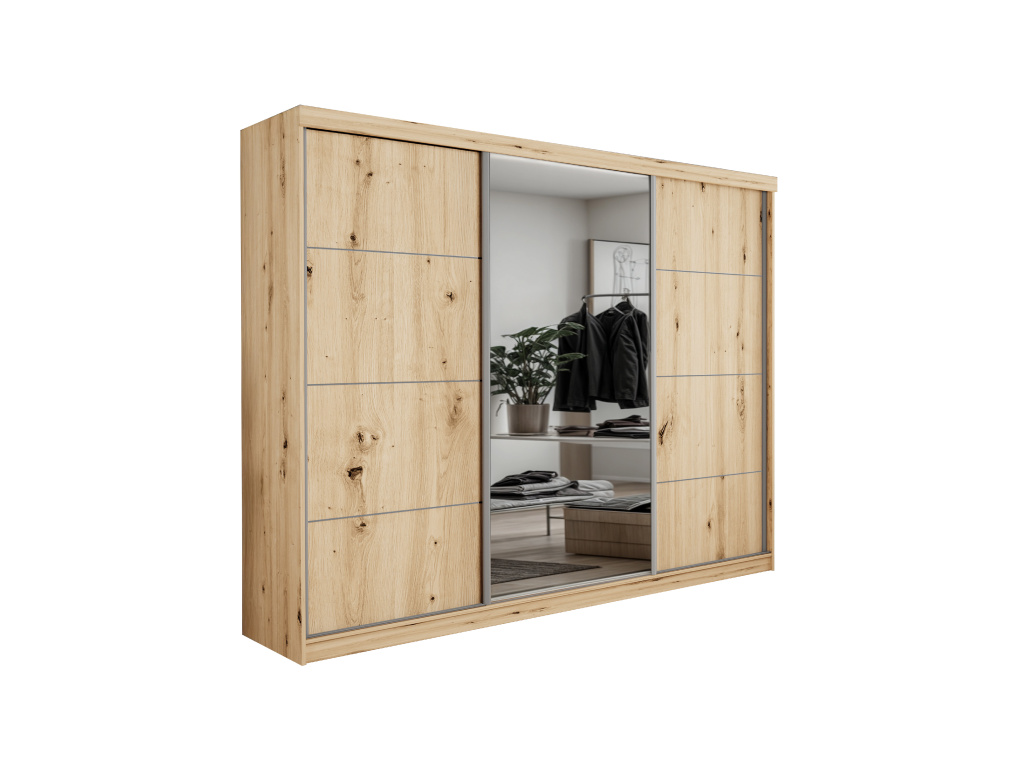 Šatní skříň Palma 250 v nadčasovém provedení Dub artisan zaujme moderním designem a velkorysým úložným prostorem, praktické posuvní dveře šetří místo v interiéru a integrované zrcadlo opticky zvětšuje místnost i zvyšuje komfort každodenního používání, díky kvalitnímu zpracování je skříň ideální volbou pro stylovou a funkční ložnici.