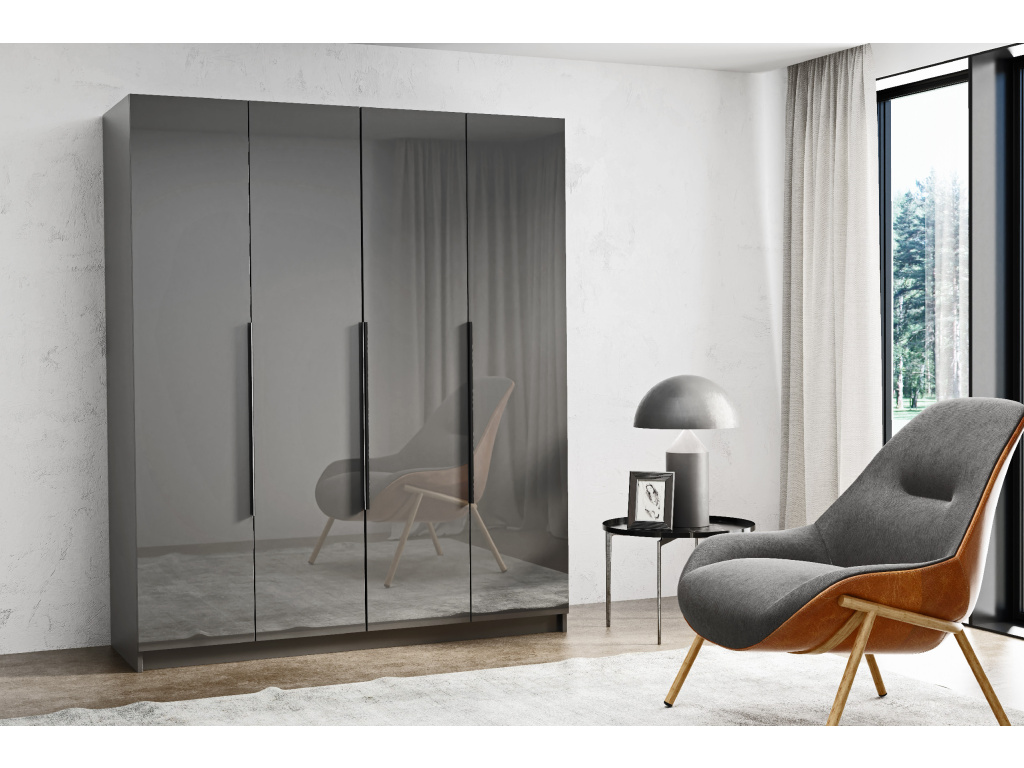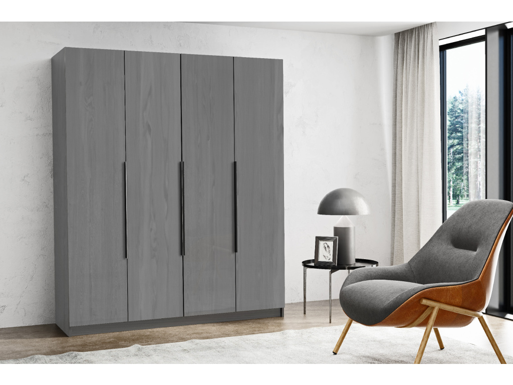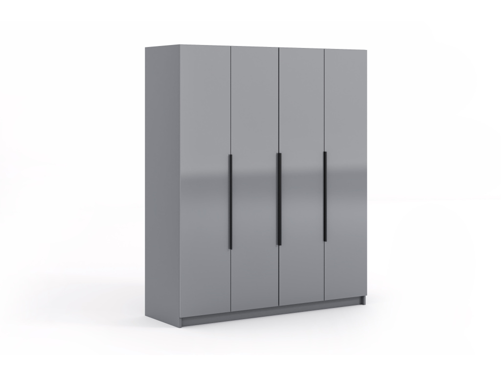 Skříň Paris v elegantním šedém provedení je ideální volbou pro moderní interiér, matný korpus v šedé barvě je doplněn lesklými šedými čelními plochami, které dodávají skříni luxusní a nadčasový vzhled, čtyři praktické dveře s výraznými černými úchytkami zajišťují pohodlný přístup k uloženým věcem, díky rozměrům 160 × 216 × 60 cm nebo 180 × 216 × 60 cm nabízí skříň dostatek úložného prostoru a stává se výrazným designovým prvkem ložnice.