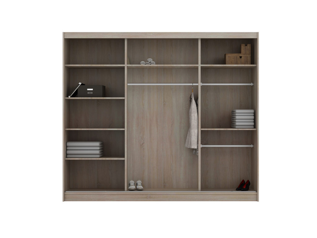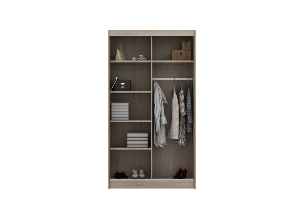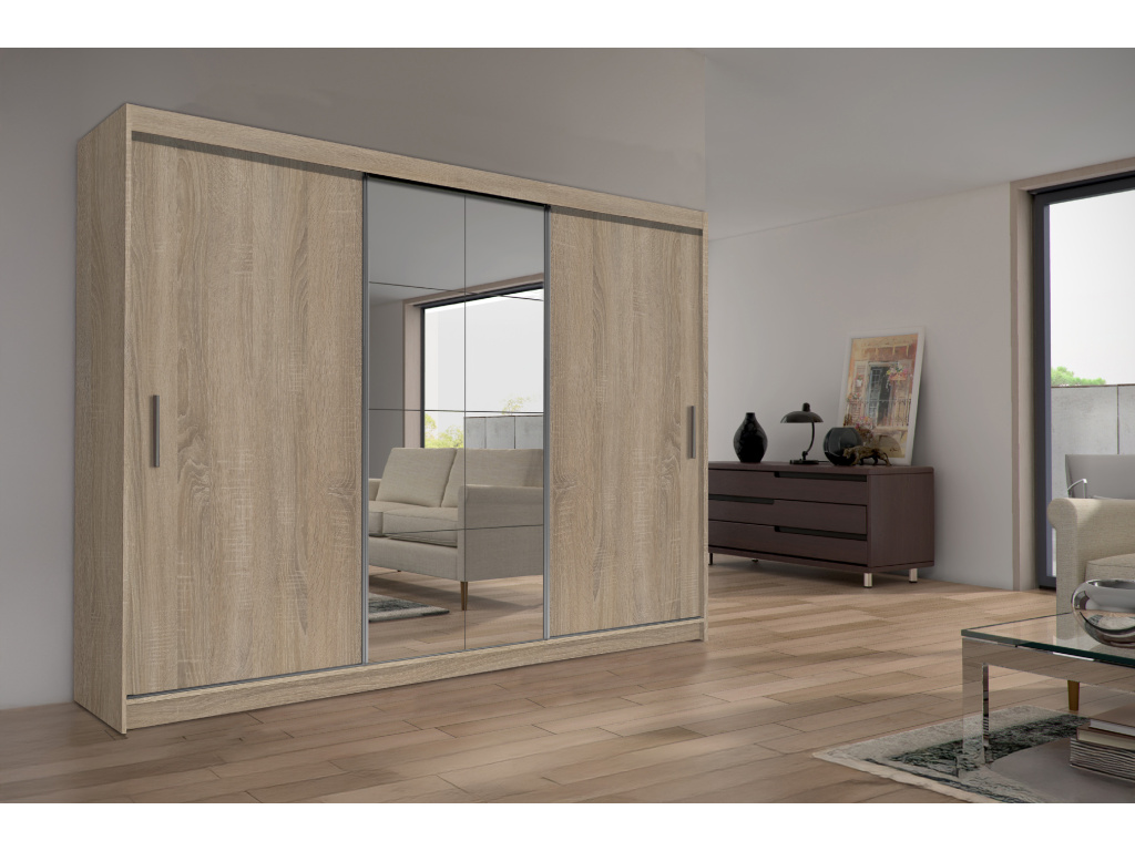Šatní skříň PESO v oblíbeném provedení Dub sonoma nabízí moderní vzhled a praktické využití prostoru, posuvní dveře se zrcadlem šetří místo a zároveň opticky zvětšují interiér, díky možnosti výběru šířky 120, 150, 203 nebo 250 cm se skříň snadno přizpůsobí každé místnosti a poskytne dostatek úložného prostoru pro přehledné uložení oblečení i doplňků.