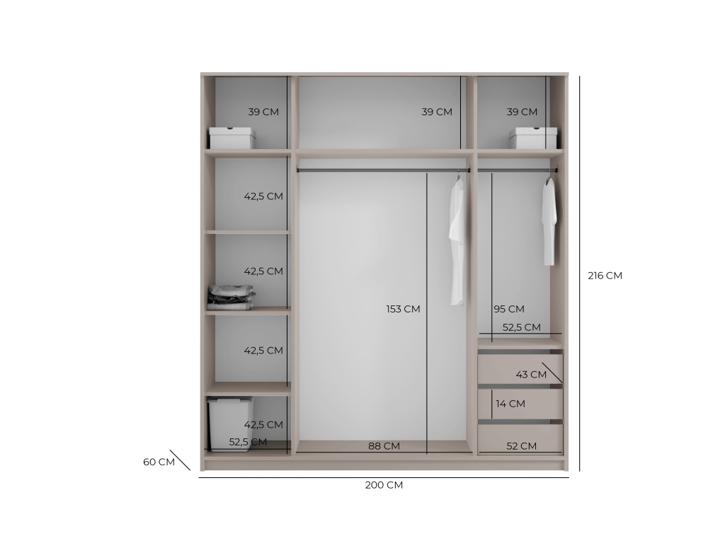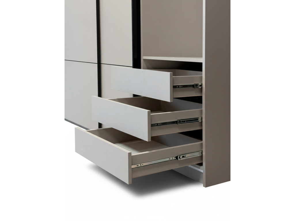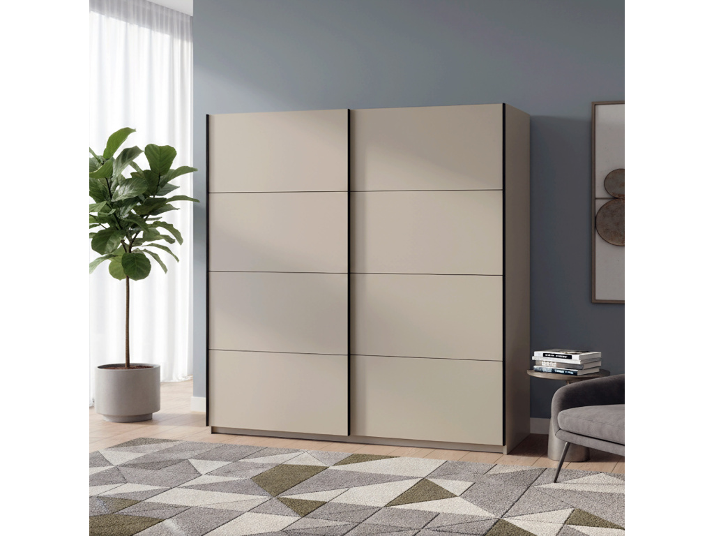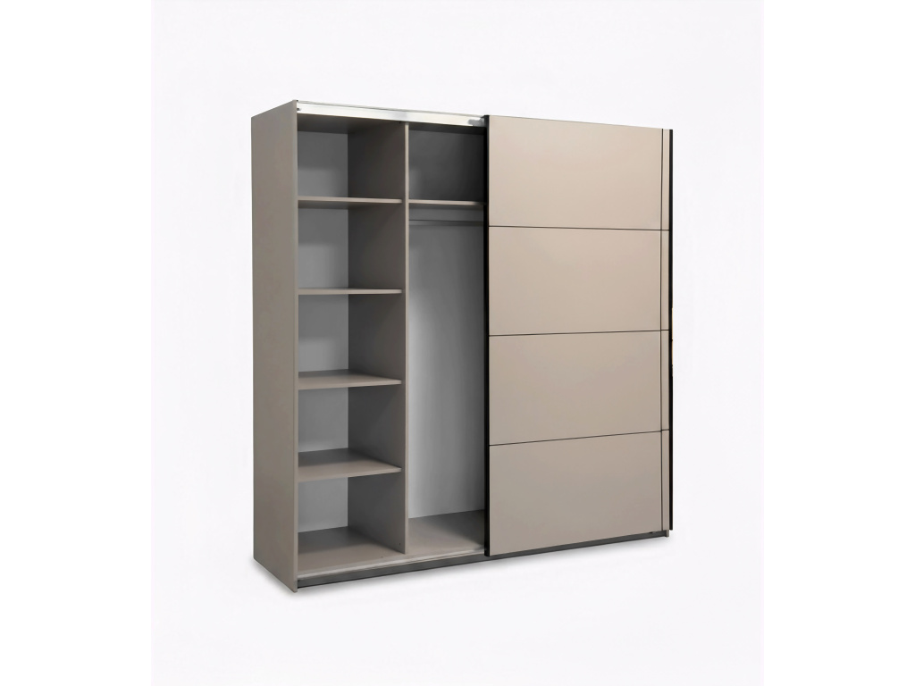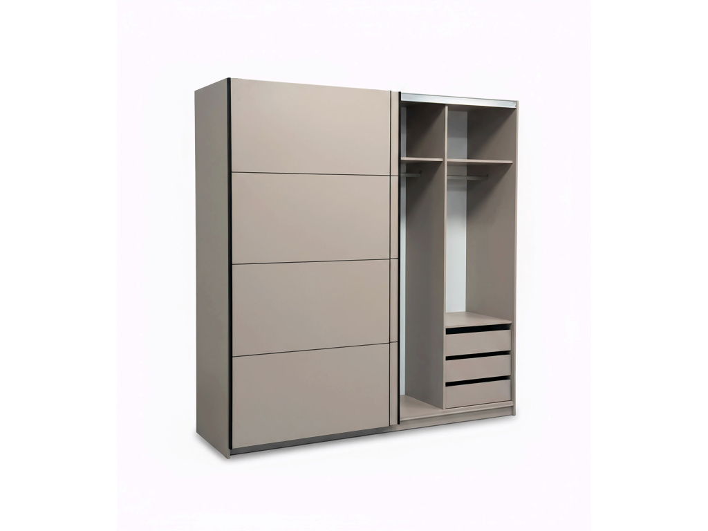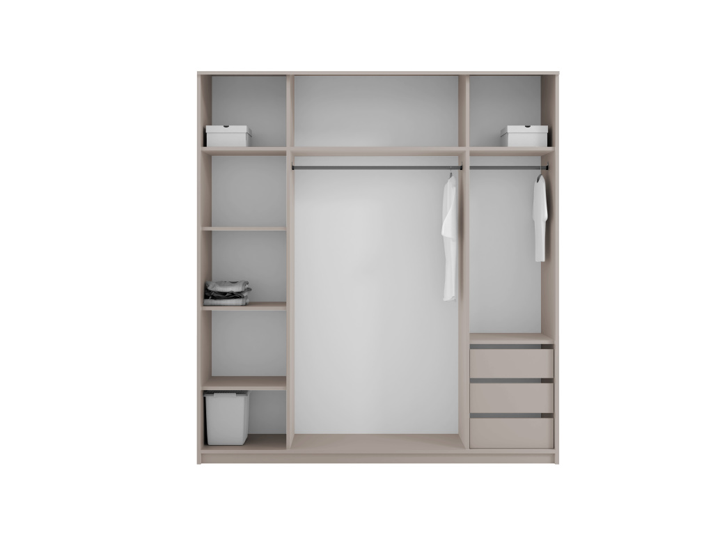 Šatní skříň REA 200 v elegantním barevném provedení Kašmír nabízí moderní design a praktické řešení úložného prostoru, posuvní dveře šetří místo v místnosti a zajišťují pohodlné používání, zatímco vnitřní kontejner se třemi šuplíky umožňuje přehledné uspořádání oblečení a doplňků, díky čemuž je skříň ideální volbou pro stylovou a funkční ložnici.
